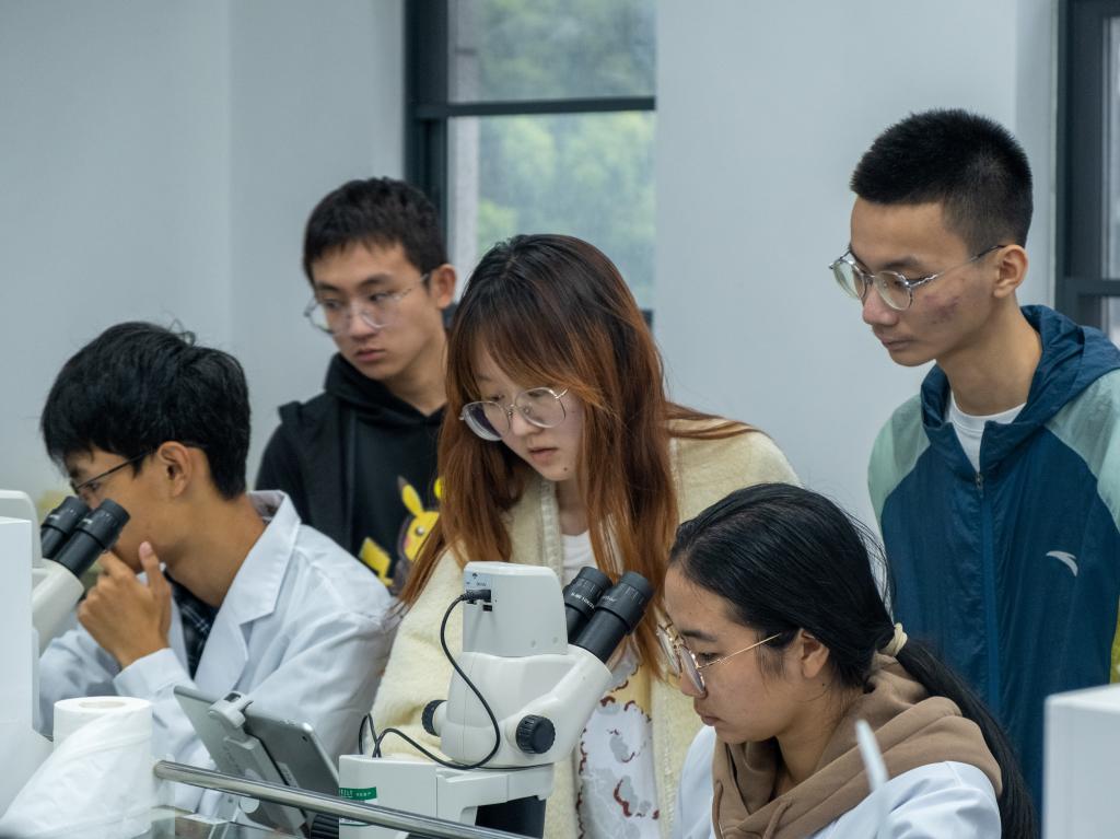 在昆虫标本的显微观察过程中,同学们通过体视显微镜观察昆虫的针插标本,透过显微镜的小小镜头,感叹于昆虫结构的粗犷与精密。“这是昆虫的什么结构?它有什么作用?”同学们在交换标本观察与交流讨论中不断找出老师所讲知识的例证,王佳璐耐心细致的讲解不仅加强了同学们对知识的理解,更是带领大家领略了昆虫的微观世界之美。