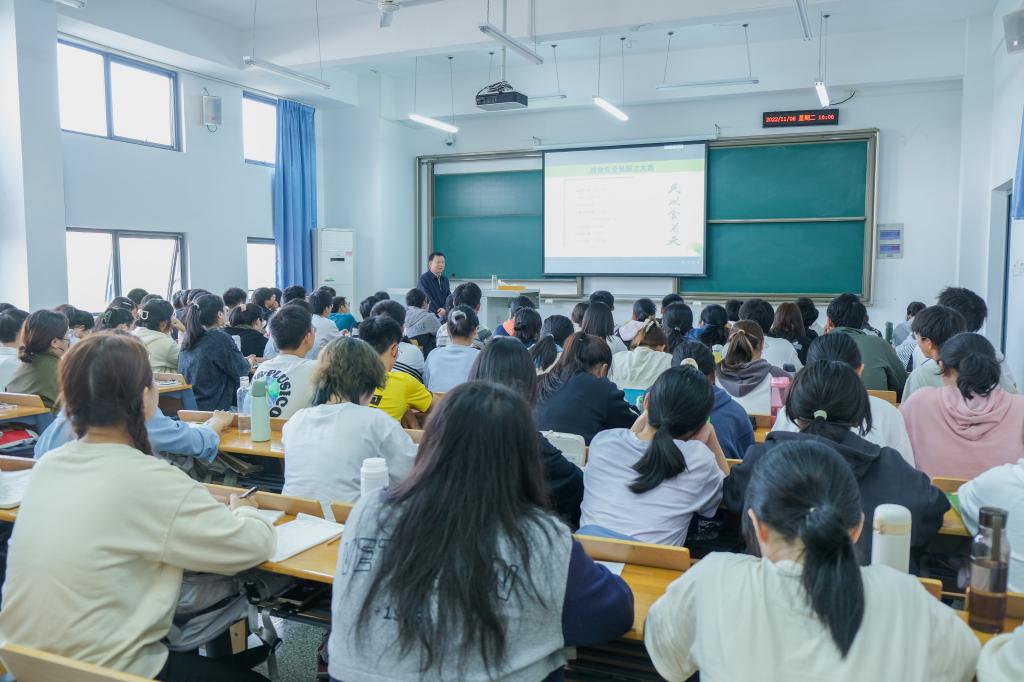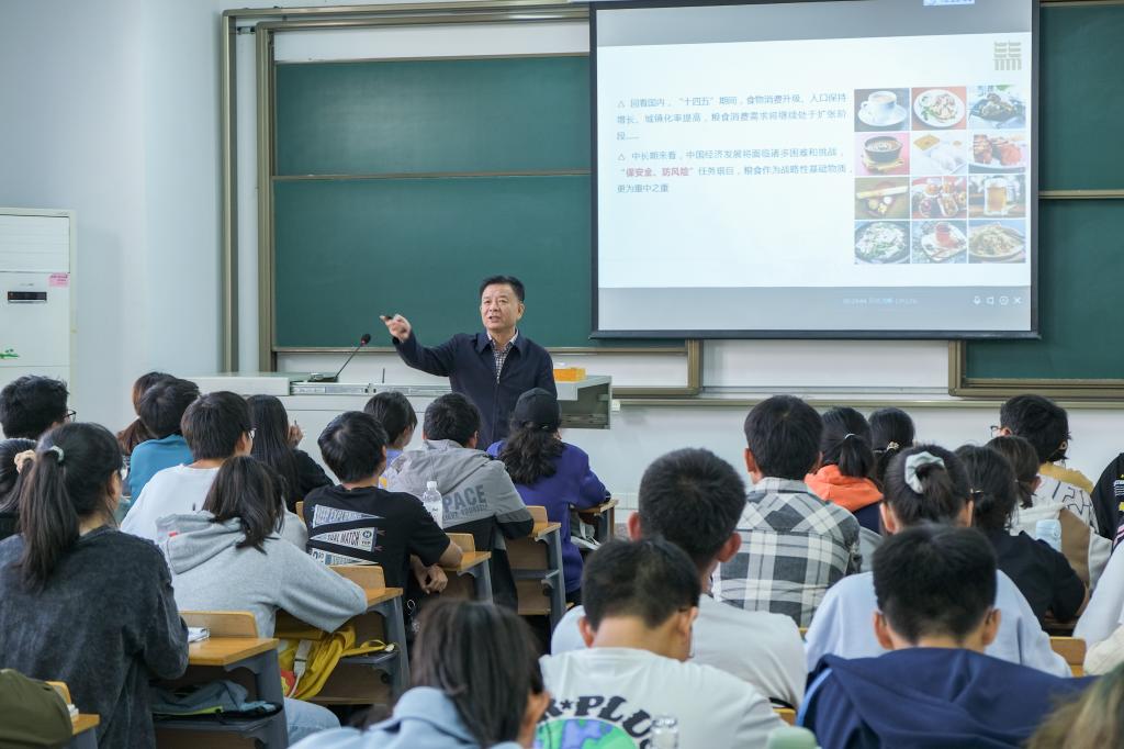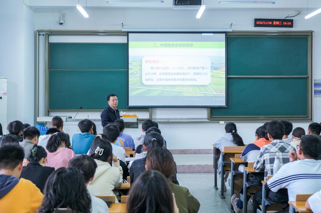 接着,姚江林从粮食产量、耕地面积两个方面着手,剖析中国粮食现状。他谈到,从2015年到现在我国粮食产量连续七年保证在粮食安全线以上,人均粮食占有量高于世界平均水平。我国超高的粮食自给率需要健全的粮食储备系统,他表示,“粮食的生产、加工和储备的全产业链怎么衔接,这是在座每一位同学需要思考并解决的问题。”