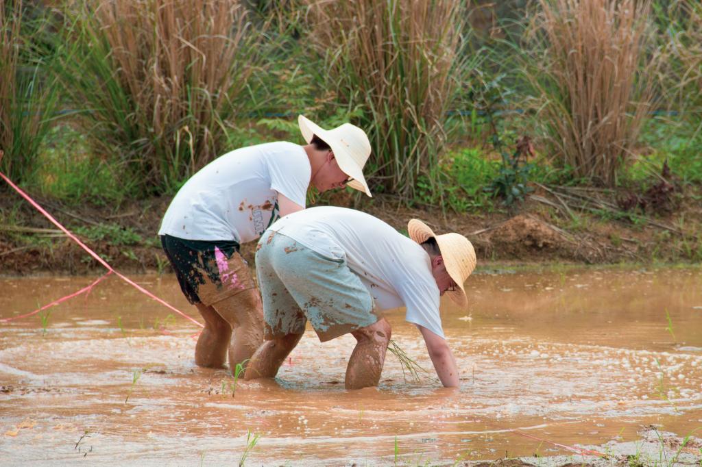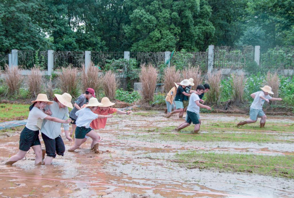 “手把青秧插满田,低头便见手中天。”选手们站在第一关的起点,手拿秧苗,蓄势待发。冲锋的号角一经吹响,选手们肩搭着肩,喊着整齐的口号,迈着协调的步伐冲向终点。水田的泥泞、头顶的烈日都无法阻止他们前进的步伐。冲到终点后,他们并没有停止,而是迅速低头,弯腰,插秧苗。在劳作中感受农民种地的艰辛,这种体验是独特的,奇妙的,令人印象深刻的。