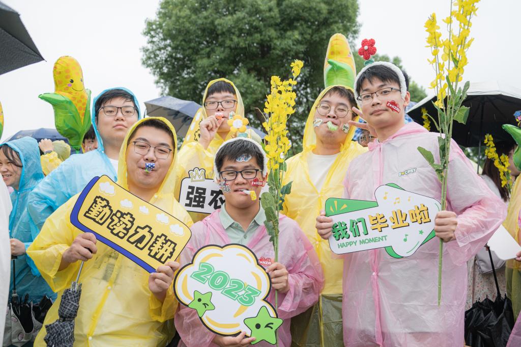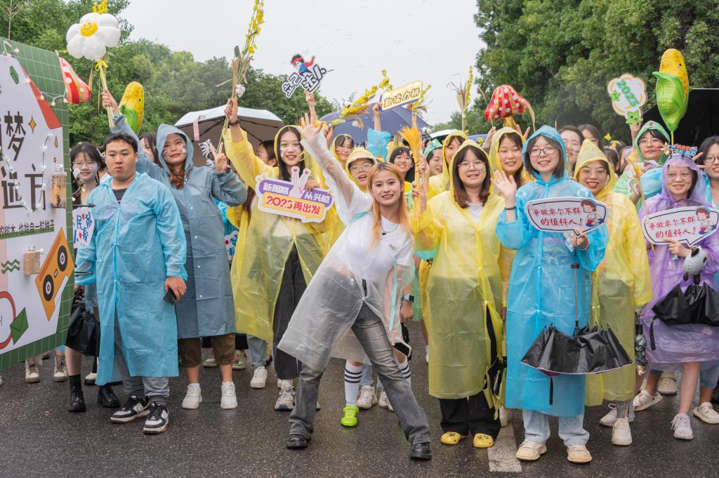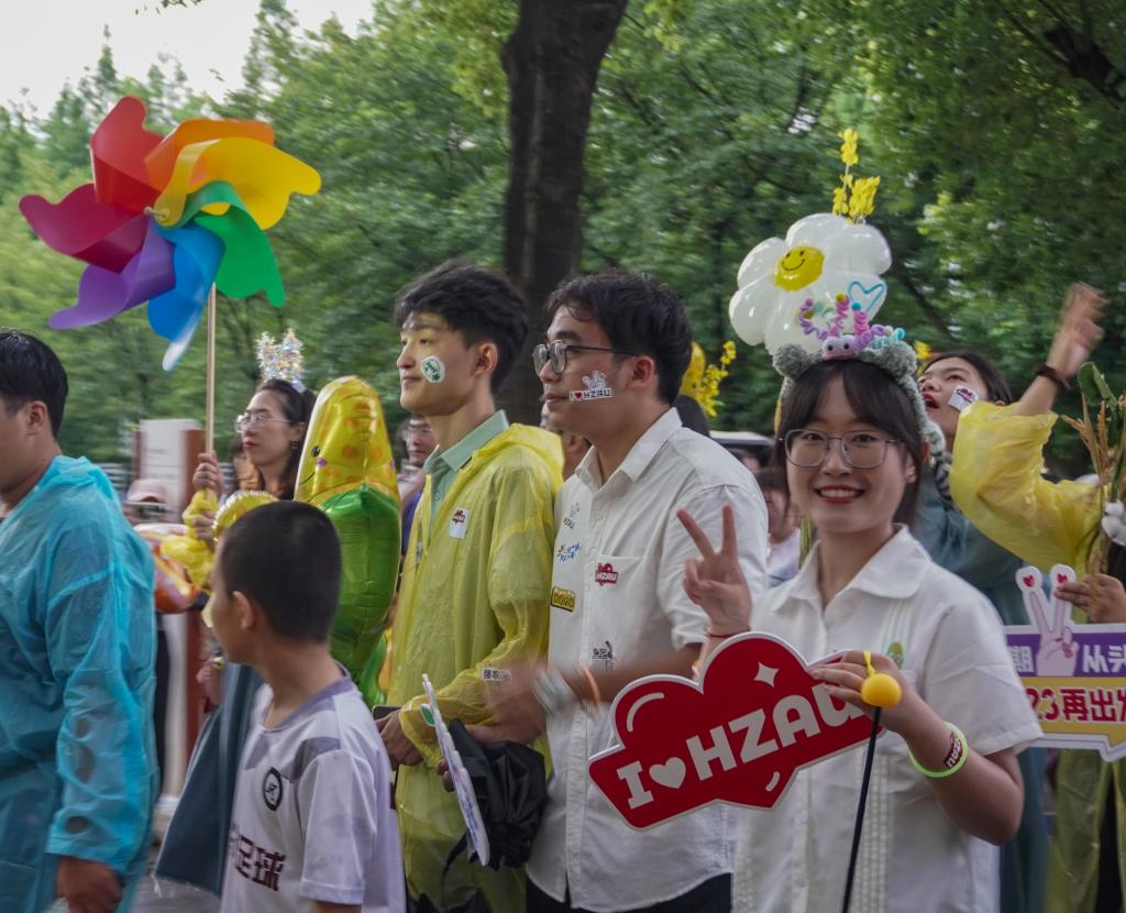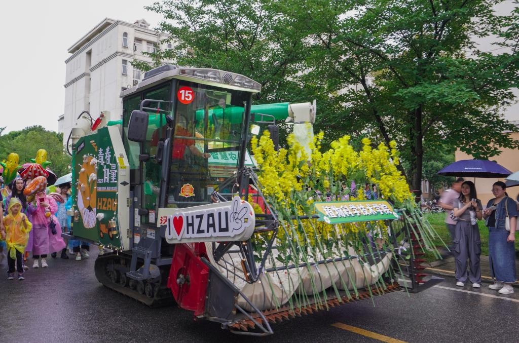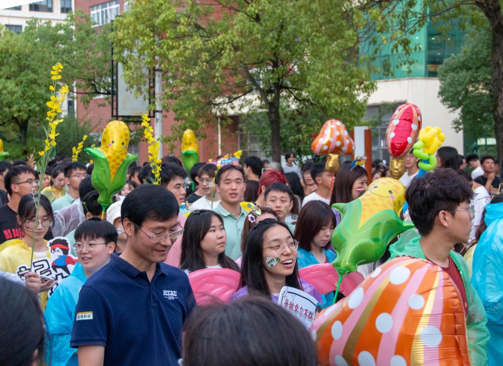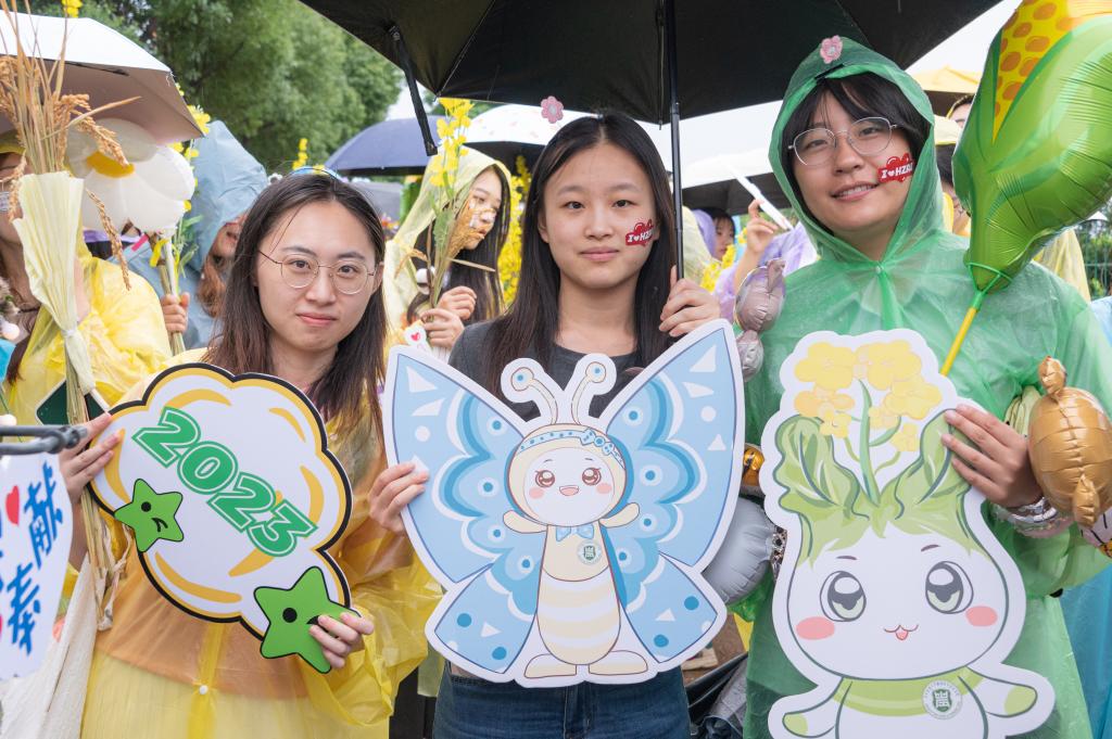 植科院组成的队伍最后出发,他们面带微笑,脸上贴着“与祖国同行”“为人民奉献”的贴纸,他们手持着“知农爱农”“争做卓尔不群的植科人”“我们毕业啦”等卡牌,传递着对毕业生们最真挚的期许与祝福。