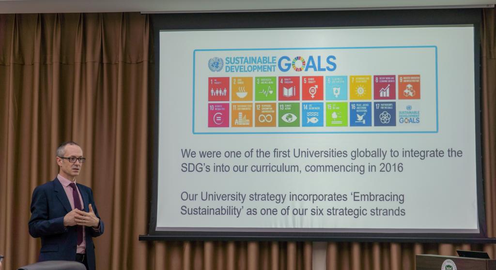 会上,Neil Mansfield简要介绍了英国诺丁汉特伦特大学的基本情况和办学特点。诺丁汉特伦特大学成立于1843年,已有180多年的办学历史,全英综合排名第12位,在过去6年里连续5年荣获全英“年度最佳大学”。公司聚焦5个研究主题,包括可持续未来研究、公民和社会安全保障研究、医疗技术和先进材料研究、科学、管理与发展研究和身心健康研究。诺丁汉特伦特大学是全球首批将“可持续发展”纳入教学课程的大学之一,在世界绿色大学排行中位列第4,始终将可持续发展作为研究目标。