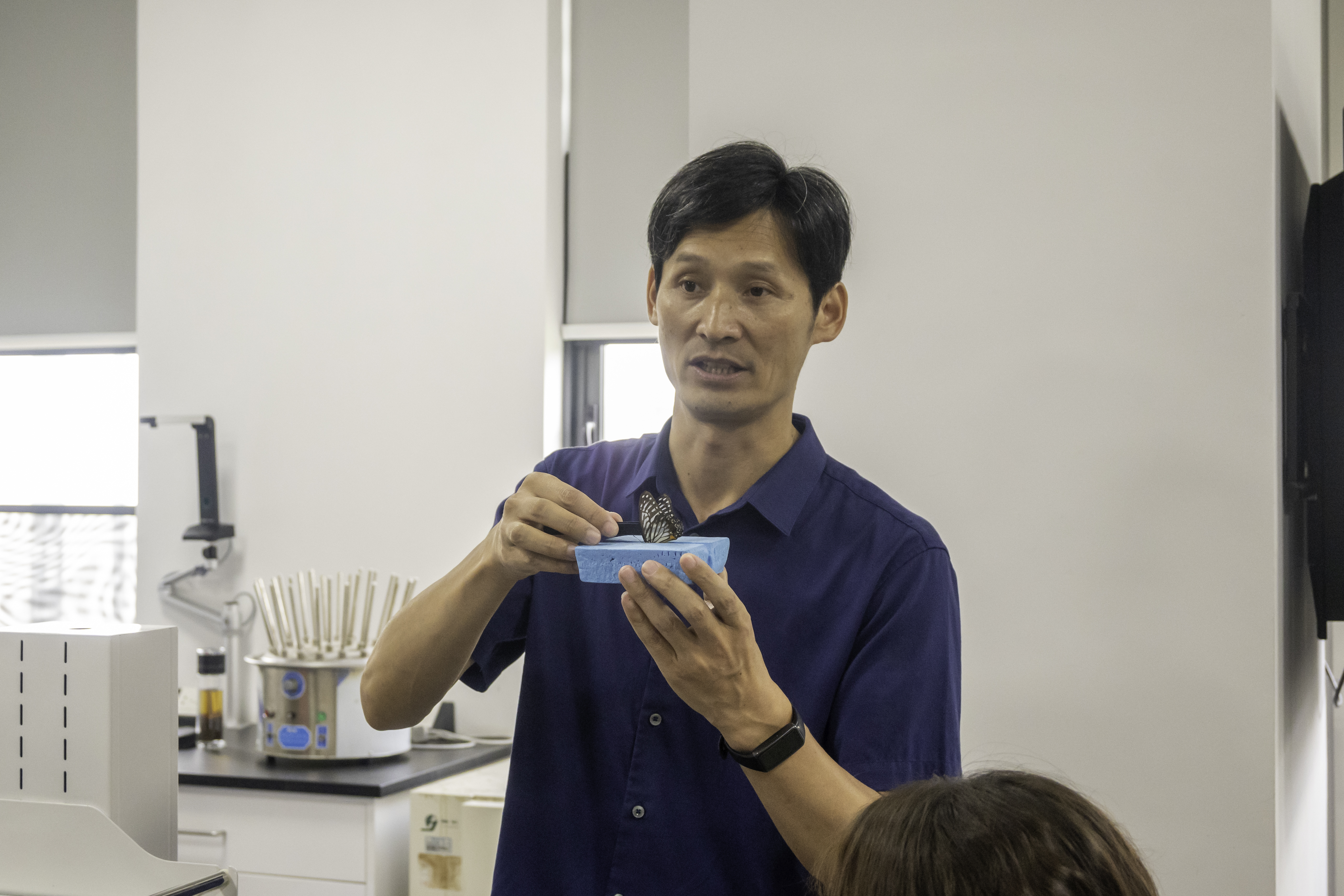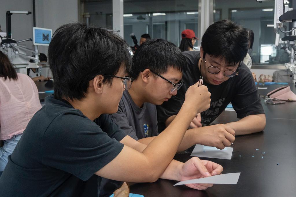 “插针固定时针要与蝶体躯垂直”“展翅时切记勿使蝶翅受过多摩擦”……活动进入蝴蝶标本制作环节,同学们使用展翅板、镊子、硫酸纸、大头钉等材料,拉开前翅,调整触角,不多时,一个个蝴蝶标本便在同学们手中振翅欲飞。