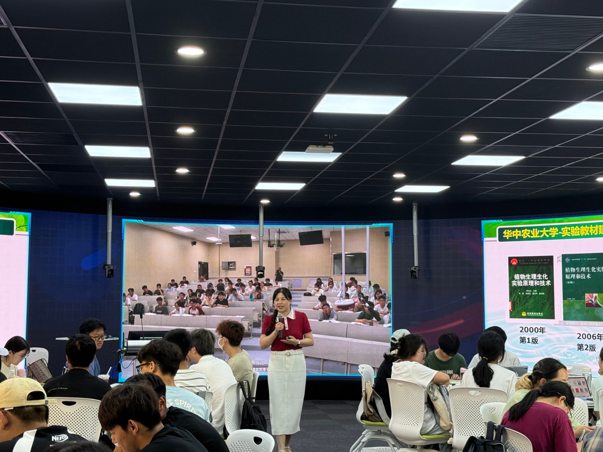 同步课堂上,丰胜求介绍了华农植物生理学的课程建设、教材建设和团队建设,希望搭建两校深度的教学与科研合作桥梁。随后,小组课堂汇报“作物引种的流程及注意事项”,聚焦跨纬度引种面临的温度和日照长度的差异导致的引种困难,以小麦北种南引失败的案例,结合春化作用与光周期的理论知识,小组提出了解决方案。讨论环节,丰胜求引导员工思考短日植物南种北引为什么会导致作物生育期延迟,以此引入“光周期与植物成花诱导”的教学内容,并以短日植物大豆为例,从全国大豆产区引导员工比较不同地区大豆品种的临界日长特点,最后推荐员工阅读Nature Genetics上两篇关于大豆光周期驯化分子机制的文献。通过一节生动完整的课堂,帮助员工建立“理论——实践——解析分子机制”的思维链条,为解决区域农业生产中的实际问题提供了科学视角。