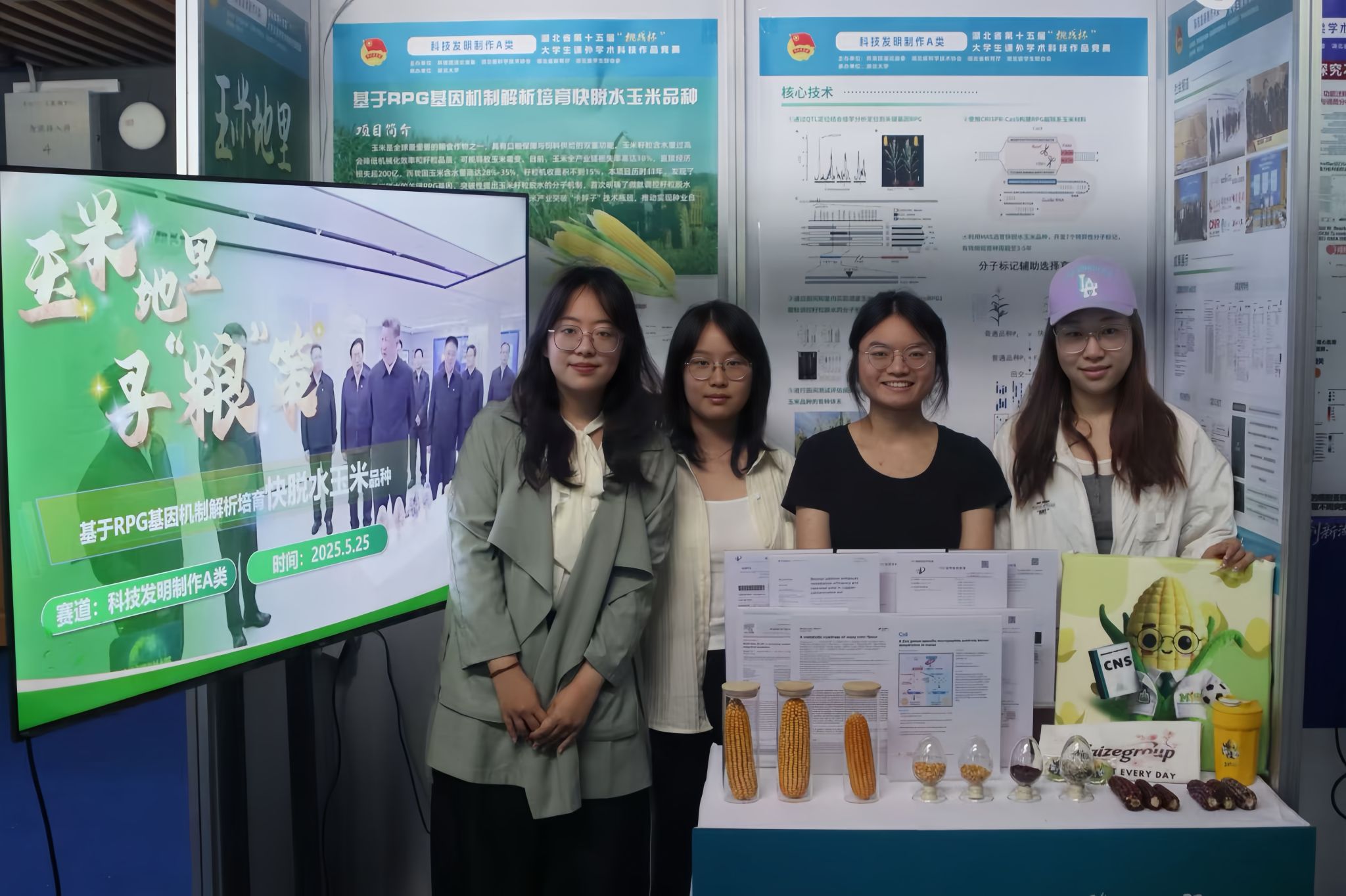 该项目团队由公司严建兵教授、肖英杰教授共同指导,成员包括硕士生陈安(2023级)、周海燕(2023级)、吴冰杰(2023级)、马骋(2024级)、王琳婕(2023级),本科生夏吴晶(2022级)、刘嘉怡(2022级)、杨紫(2022级)。 团队紧扣国家粮食安全战略,针对玉米收获期含水量高导致机收破损率达10%、黄曲霉毒素污染风险提升3-5倍的产业痛点,聚焦籽粒脱水分子调控机制,首次鉴定出关键基因 RPG并构建精准育种体系,为解决宜机收玉米品种培育难题提供了原创性技术方案。