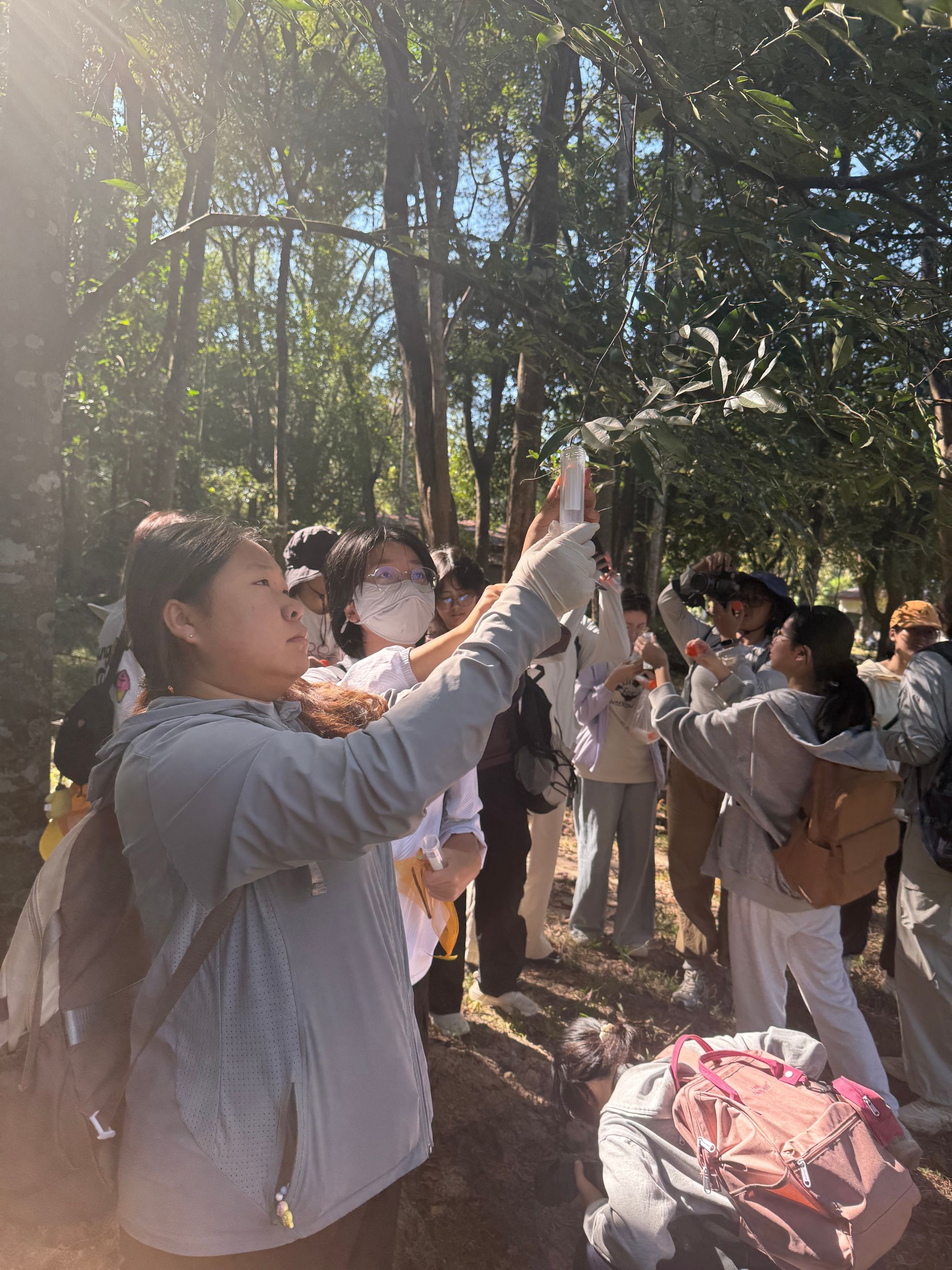 在湄公河沿岸的自然生态区,同学们进一步拓展采集范围,穿梭于河岸植被带,不仅精准捕捉到竹节虫,近距离观察到其与植物茎秆高度相似的拟态特征,还发现了螳螂桑螵蛸、蓑蛾幼虫的蓑袋,以及多种昆虫差异化的产卵方式。
