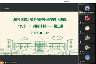 1月16日中午,植科院兼职辅导员(助管)“九个一”立体塑造训练营第三期于线上举行。文法院辅导员王美琳,植科院辅导员任伟参与此次培训。