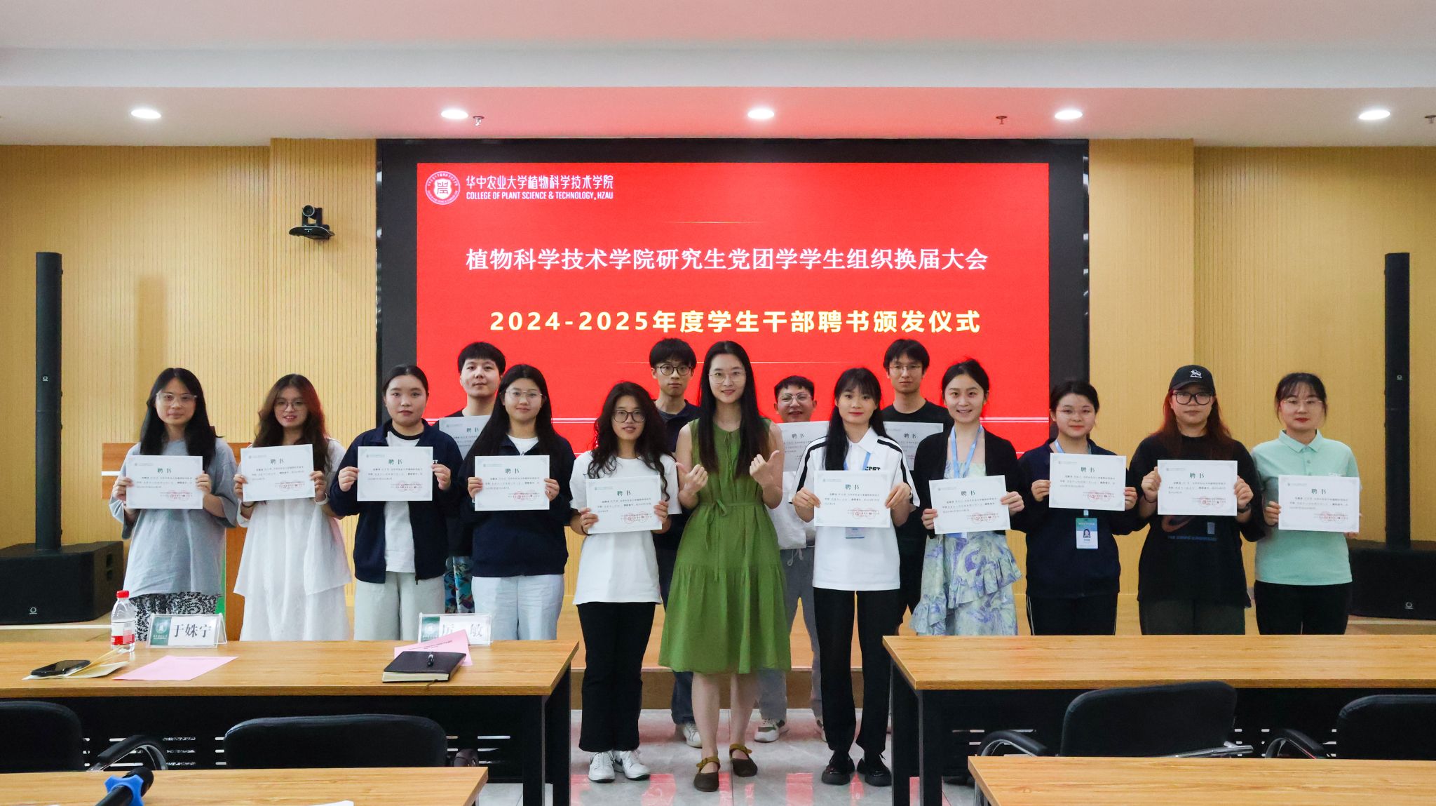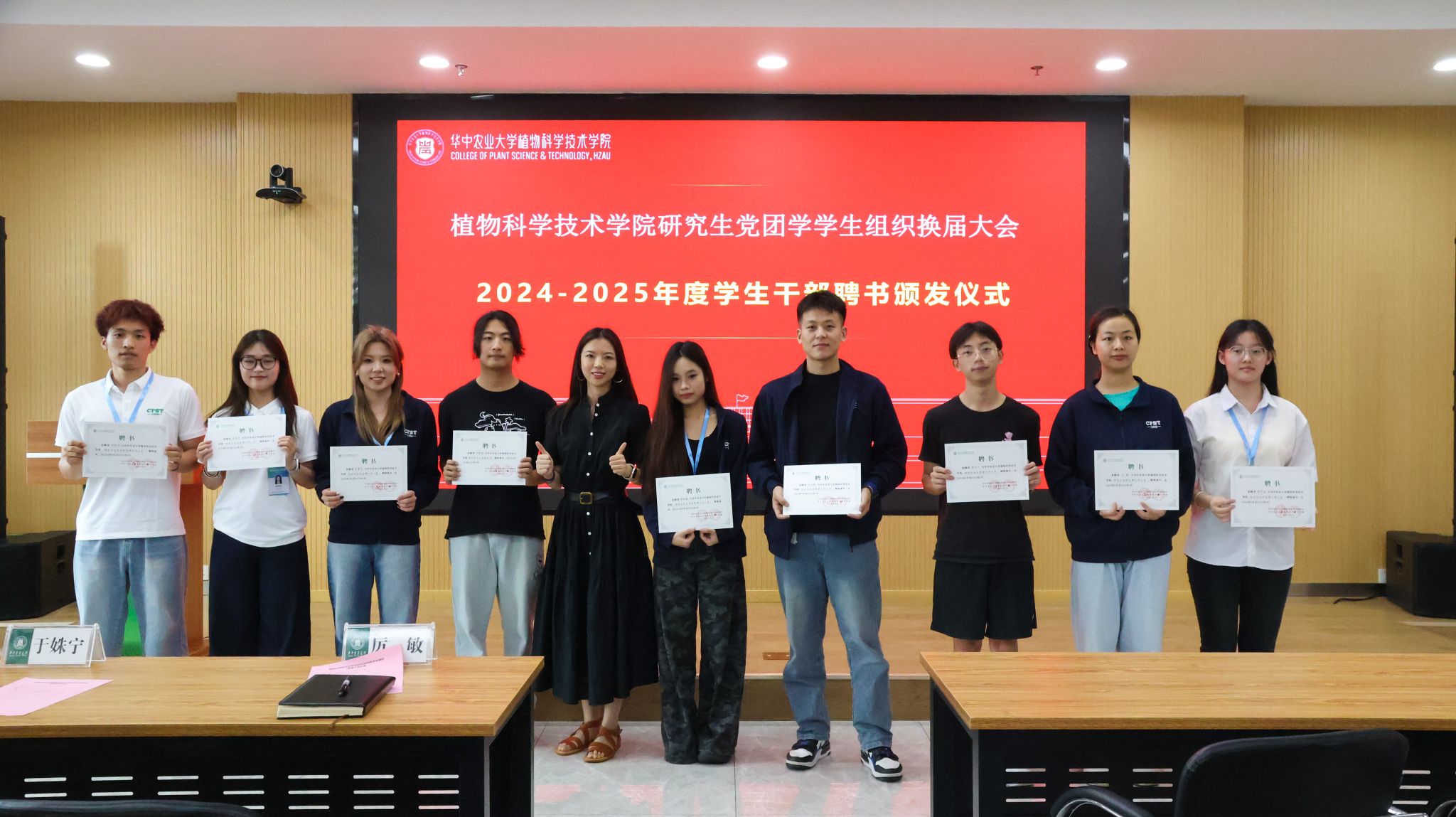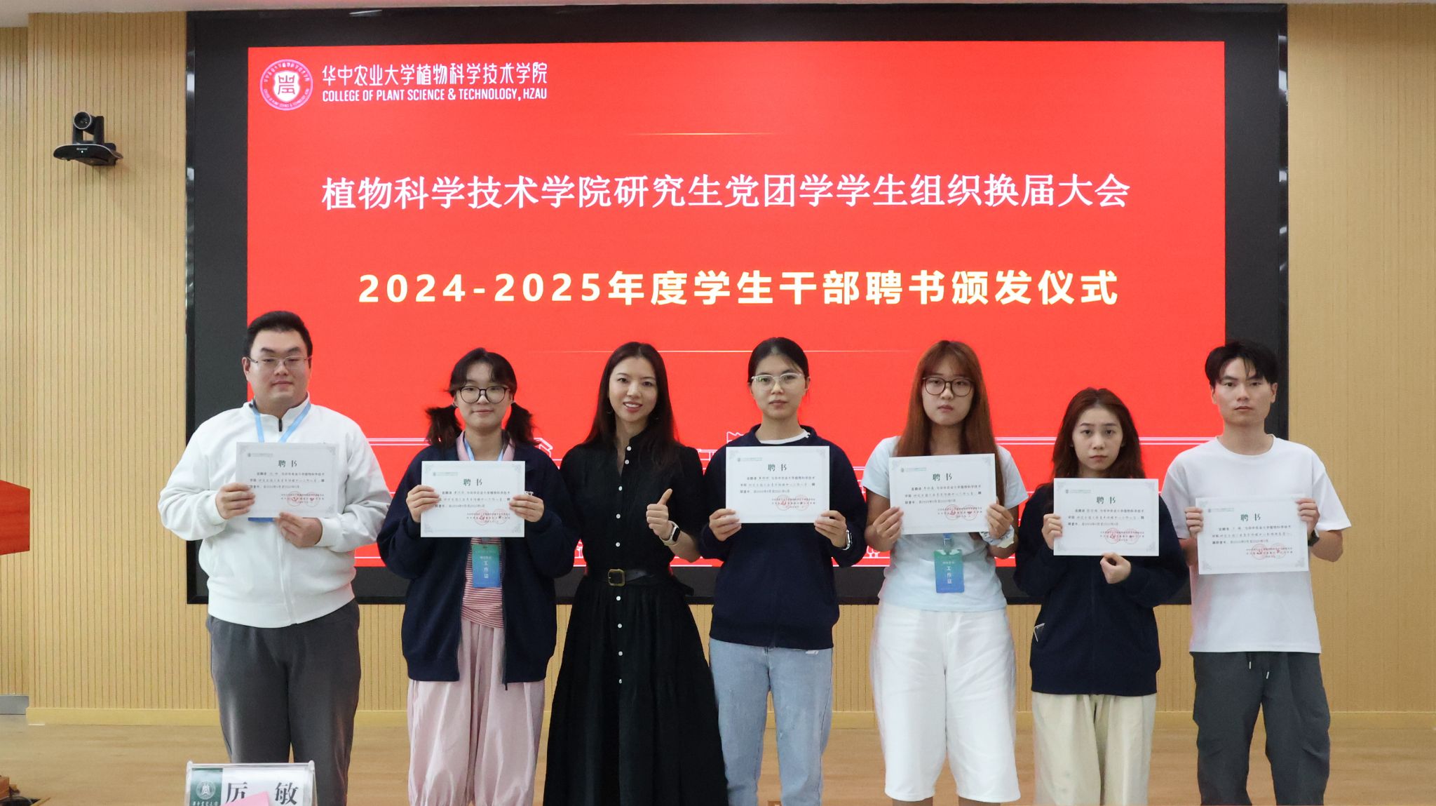 随后,厉敏、于姝宁两位辅导员为全体工作人员逐一颁发聘书,并与大家合影留念。党建中心主任徐梦婷宣读党建中心、团工委、研究生会换届名单。