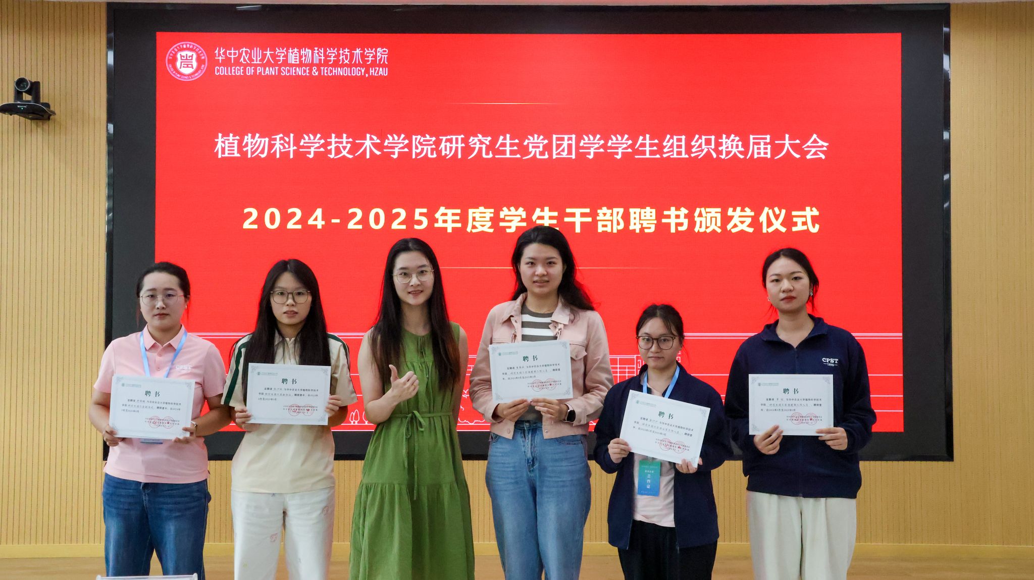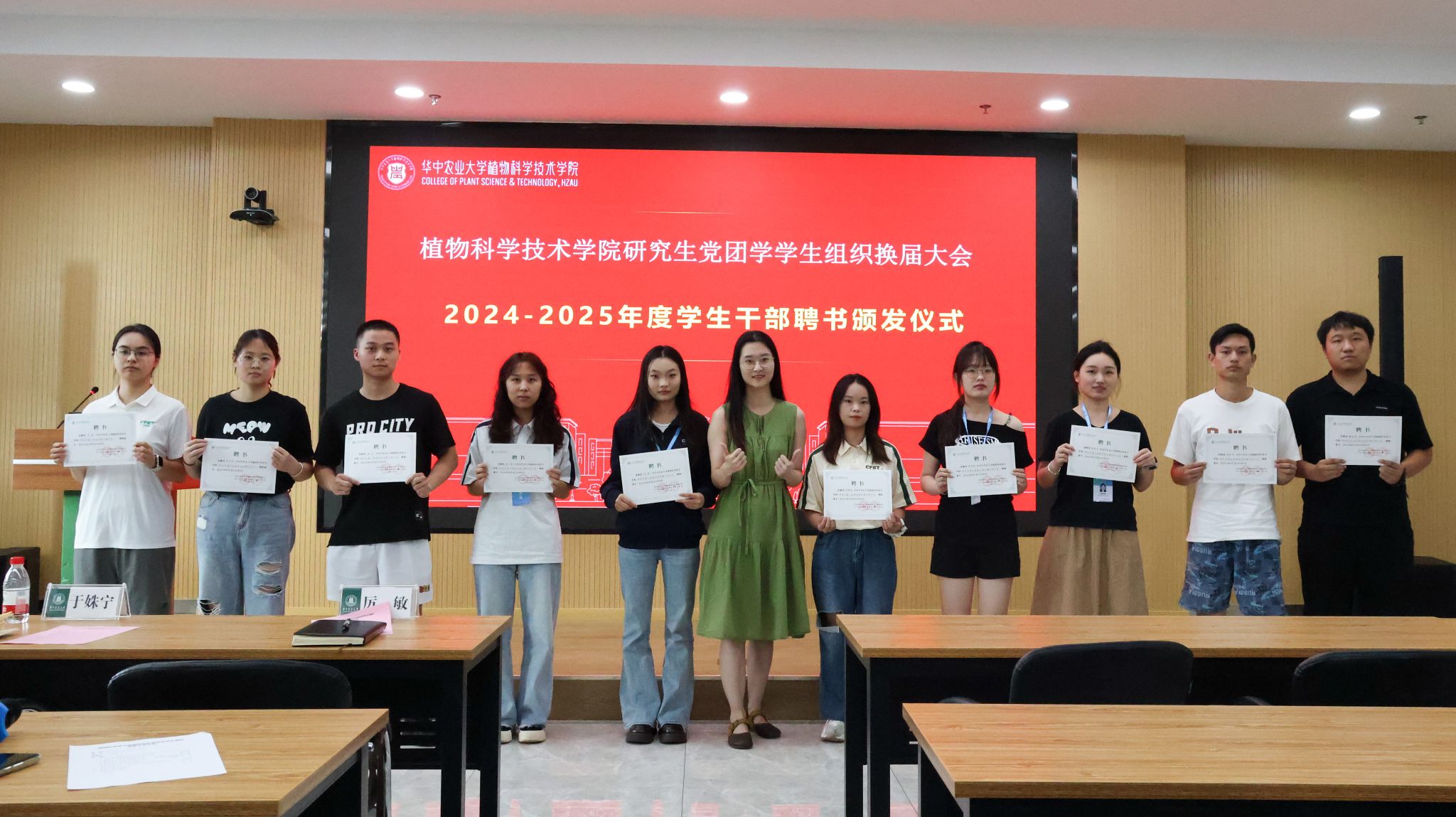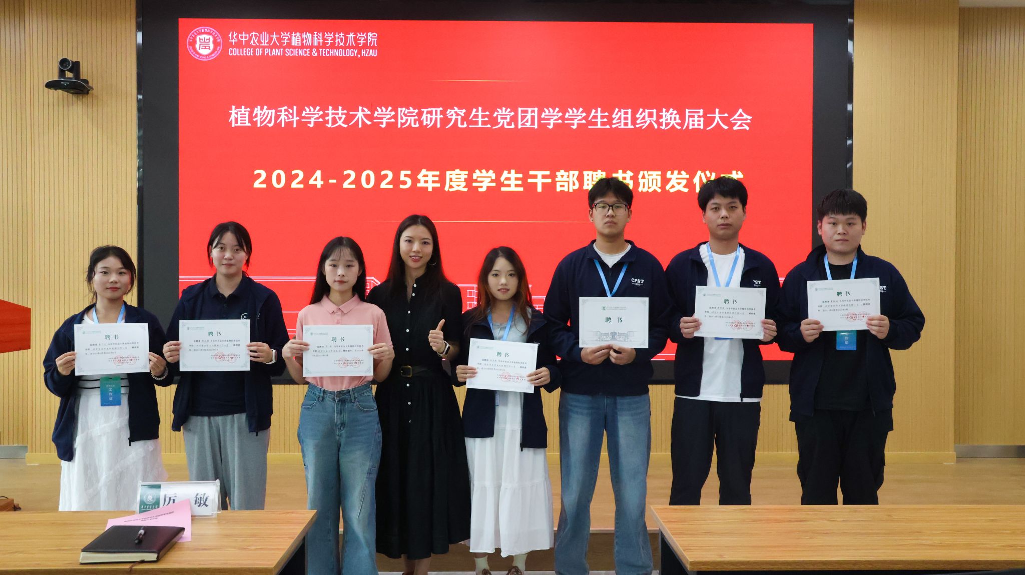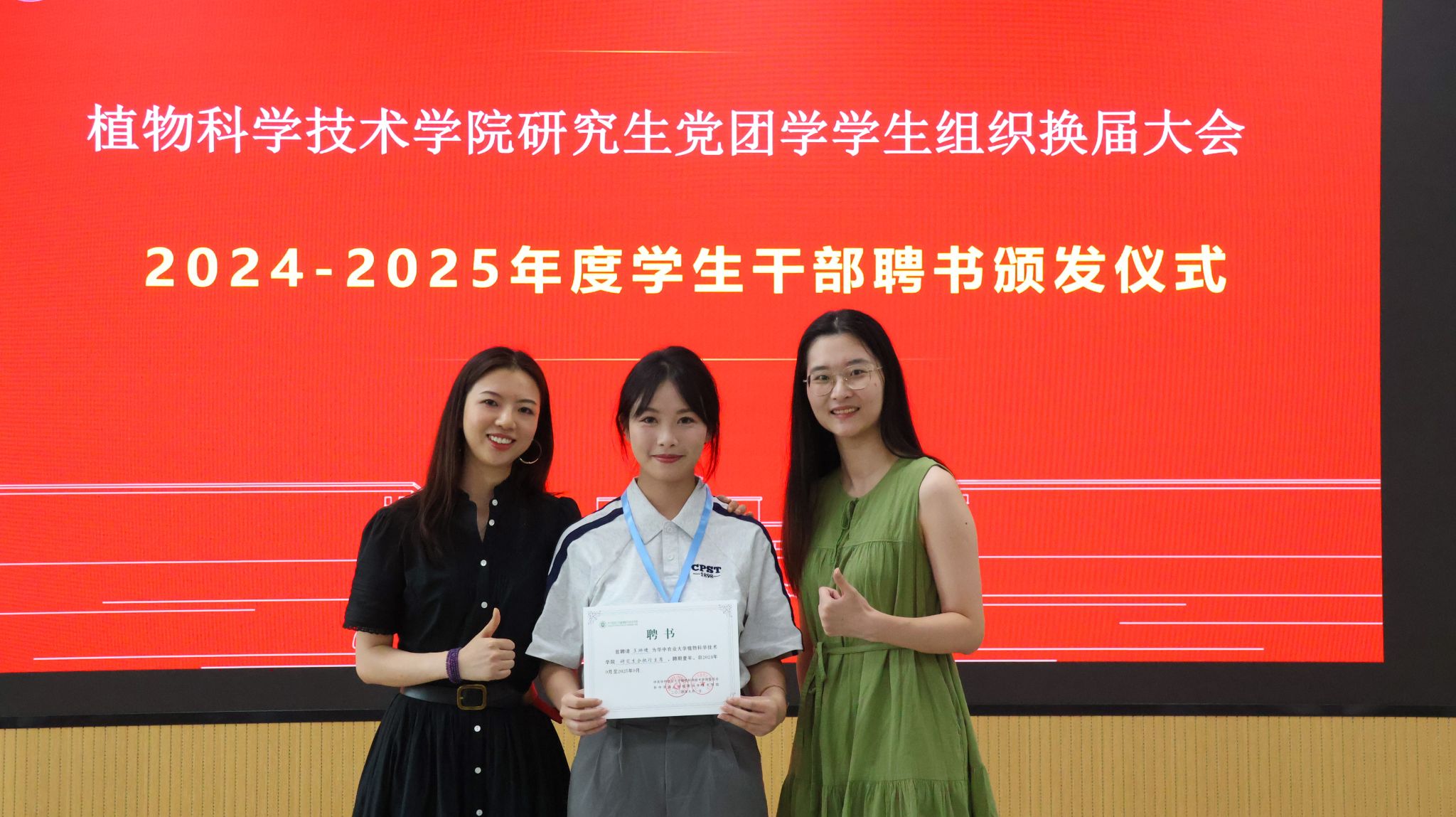 随后,厉敏、于姝宁两位辅导员为全体工作人员逐一颁发聘书,并与大家合影留念。党建中心主任徐梦婷宣读党建中心、团工委、研究生会换届名单。