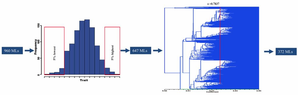 该研究基于一个8亲本的陆地棉MAGIC(multi-parent advanced generation intercross)群体(长江大学李定国创建),从960份MAGIC自交系中通过表型和SSR基因型挑选出具有代表性的372份材料(SMLs)。利用SLAF-seq技术对372份材料和8个亲本进行SNP基因型检测,筛选获得60,495个有效SNPs;结合3年6个环境的表型数据,对9个重要农艺性状进行GWAS,以连锁不平衡衰减区间作为参考值,共鉴定到117个QTL位点;有3个QTL位点在多个环境中表现稳定,11个QTL位点与多个性状相关。利用基因组织表达量数据,从QTL候选区间鉴定到154个与关联农艺性状的相关组织特异表达的基因。另外,参考已有的棉花基因功能研究报道,从QTL候选区间内筛选出8个功能已知的候选基因。其中,GhACT1和GhGASL3两个基因已报道与棉花纤维发育相关,位于纤维伸长率的QTL候选区间内。