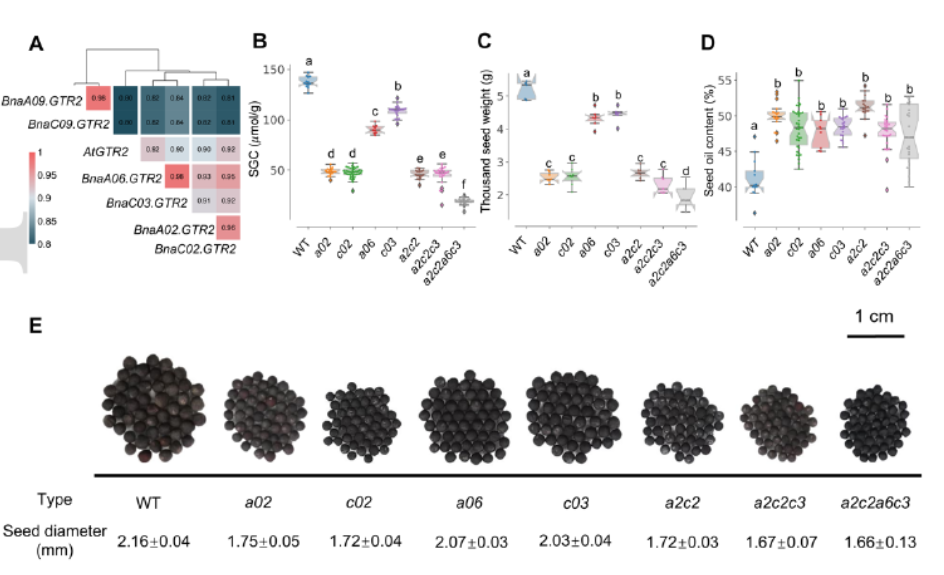 为了验证BnaC02.GTR2的基因功能,研究使用CRISPR/Cas9基因编辑技术构建Bna.gtr2s敲除突变体,发现BnaC02.GTR2及其三个同源基因都能正向调节种子硫苷的积累。值得注意的是,与野生型相比,BnaC02.gtr2突变体苗期叶片中硫苷含量显著降低,而根中硫苷含量显著增加,这说明根系合成的硫苷向其他营养组织的转运可能受到抑制。此外,我们观察到这些Bna.gtr2s突变体的种子变小,蛋白质含量降低而种子油含量升高。RNA-seq和相关性分析都表明,Bna.GTR2s可能在种子发育中发挥综合作用,如氨基酸的积累、硫苷合成、糖的同化和油的积累。