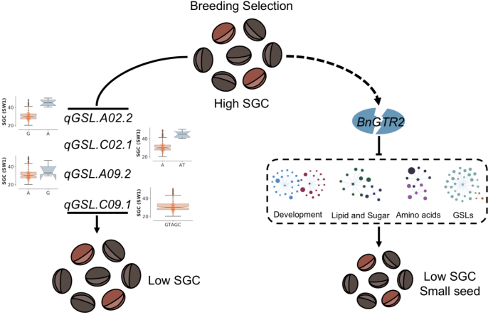 该研究通过 GWAS、TWAS 和共表达网络分析,在基因组和转录组水平上对油菜种子硫苷含量的遗传基础进行研究,揭示了油菜低种子硫苷改良的育种选择历史,并且为 Bna.GTR2s 在油菜种子硫苷积累和种子发育中的分子功能提供了新的见解,为构建“种子低硫苷营养组织高硫苷”的育种模型具有重要的指导意义。