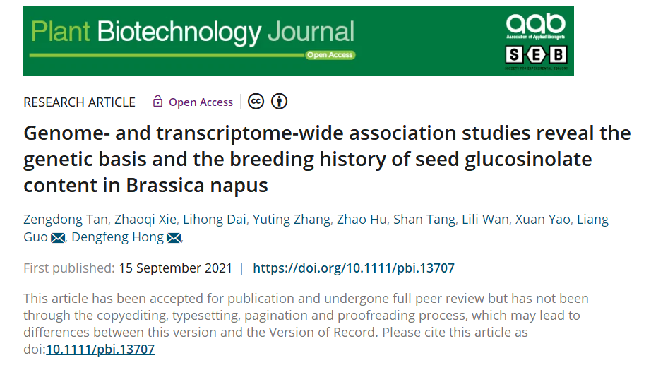近日,Plant Biotechnology Journal期刊在线发表了油菜团队题为“Genome- and transcriptome-wide association studies reveal the genetic basis and the breeding history of seed glucosinolate content in Brassica napus”的研究论文,本研究揭示了油菜种子硫代葡萄糖苷(硫苷)的遗传基础及种子低硫苷改良的育种选择过程,并对利用油菜GTR2同源基因创造种子低硫苷营养组织高硫苷的思路提供了新的见解。