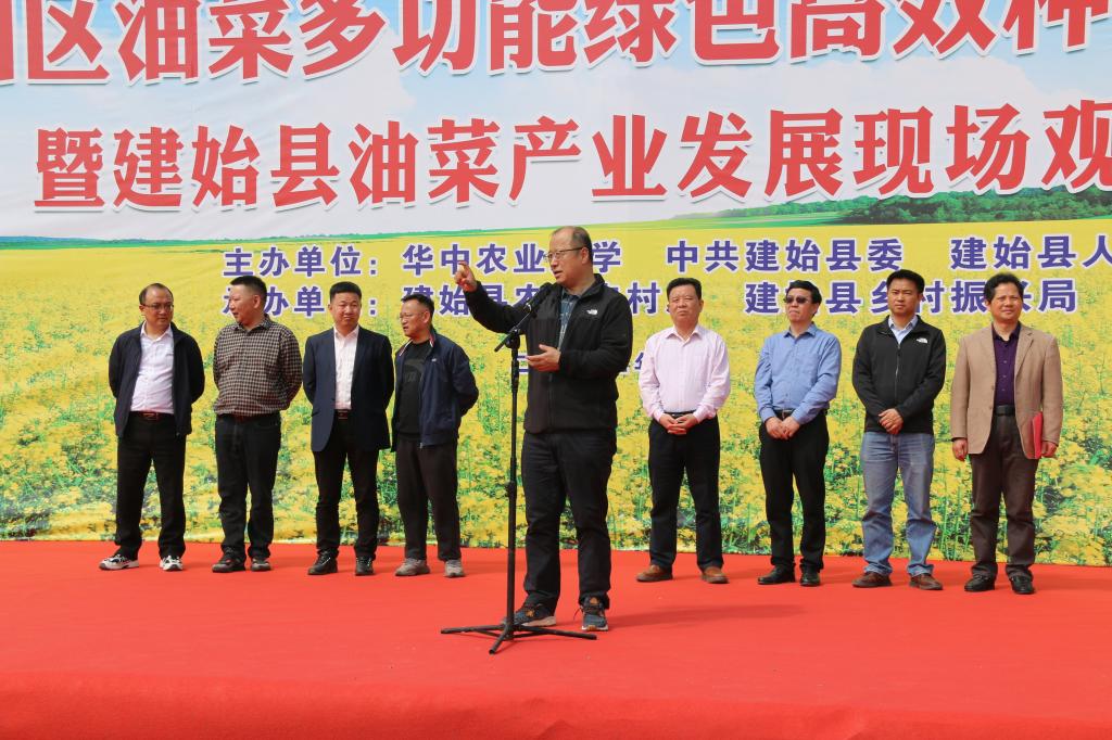 李召虎董事长在讲话中肯定了团队在建始开展的工作和取得的成效。他指出,油菜栽培团队要更好地结合建始当地的实际情况,运用团队建立的栽培技术和多功能利用技术,引进适合于山地的机械、品种。他勉励油菜栽培团队成员要联合建始县农技推广部门扎实推进示范工作,高标准做好示范点建设,更好地发挥示范点的职能,让更多的新技术在建始落地生根,为建始油菜产业发展作出“华农”贡献。