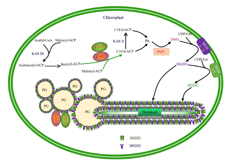 在叶绿体中,质体小球是由类囊体外膜剧烈起泡或发芽形成的,并附着在类囊体膜外部上的球状脂质体。其成分包括,定位于其核心的中性脂类(质体醌、维生素 E、维生素 K1)、脂肪酸叶醇酯类,以及位于其外层的半乳糖脂(MGDG、DGDG)和脂类结合蛋白(如丰度最高的原纤维蛋白(Fibrillins, FBN)家族,占PG蛋白总量的~53%)。PG是高等植物质体中广泛存在的一种亚细胞器,主要参与了质体代谢、质体发育转换和环境适应。然而,半乳糖脂在质体小球形成中的作用机制还未见报道。