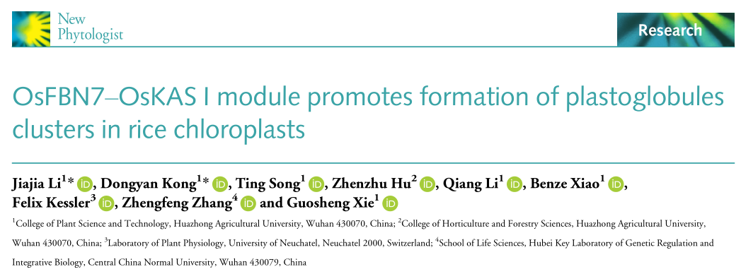 2023年6月27日,公司谢国生教授团队在《New Phytologist》发表了OsFBN7-OsKAS I module promotes formation of plastoglobules clusters in rice chloroplasts”的研究论文。该研究揭示了原纤维蛋白家族成员OsFBN7与叶绿体中脂肪酸从头合成关键酶OsKAS Ia/Ib互作,提高后者的酶蛋白丰度和稳定性,从而显著提高叶绿体中半乳糖脂(MGDG和DGGD)含量。最终,在水稻叶片叶绿体中促进葡萄串状质体小球(Plastoglobule,PG)的形成。该研究揭示了OsFBN7-OsKAS I模块在水稻叶绿体中半乳糖脂促进PG形成新机制中的作用。