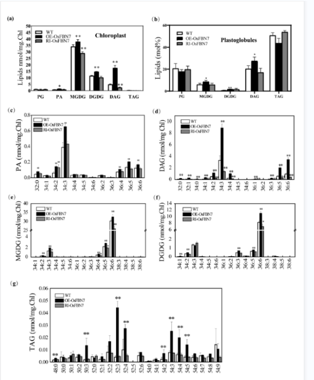 进一步,苗期RNA-seq检测表明,超表达OsFBN7能够显著上调脂肪酸去饱和相关基因(OsSAD2,OsFAB2-5)、二酰甘油合成相关基因(OsPAP1)和MGDG合成关键基因(OsMGD2)的转录水平;开花期剑叶脂质组学检测表明,超表达OsFBN7能够显著提高磷脂酸(PA),二酰甘油(DAG),单半乳糖甘油二酯(MGDG)和双半乳糖甘油二酯(DGDG)含量(图6)。