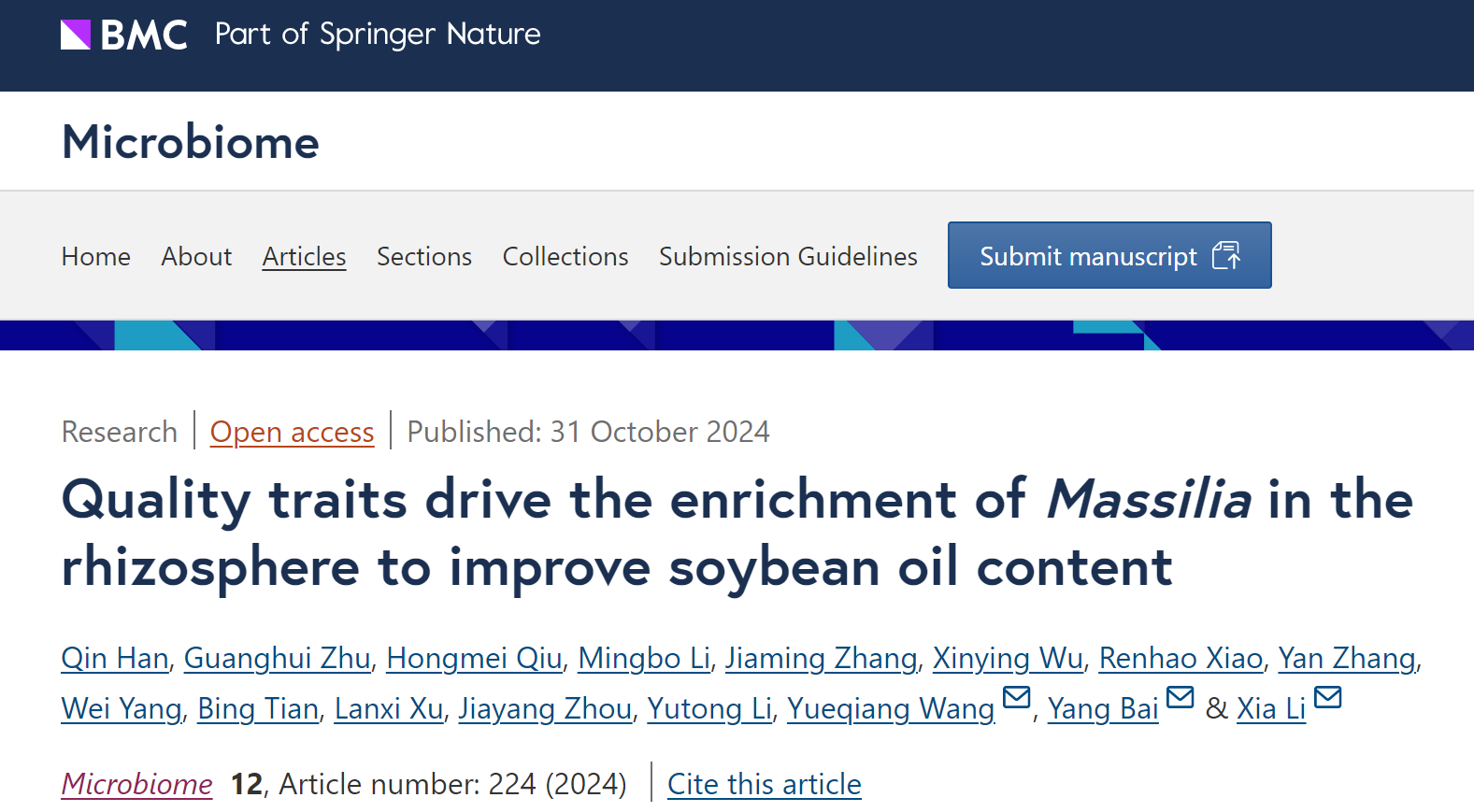 随着全球对植物油需求的不断增加,科学家们一直在探索提高大豆油含量的新方法。10月31日,公司大豆团队联合中科院遗传发育所和吉林省农科院在微生物组领域国际权威期刊《Microbiome》(2023年影响因子:13.8)在线发表了题为“Quality traits drive the enrichment of Massilia in the rhizosphere to improve soybean oil content”的重要研究论文,研究发现了一类与大豆油脂相关的微生物(Oil Associated Bacteria, OAB)并证明特定微生物马赛菌(Massilia)在大豆根际的富集能够促进根系生长并显著提升大豆油脂含量,这一发现为提高大豆油脂含量及品质改良提供了新思路。
