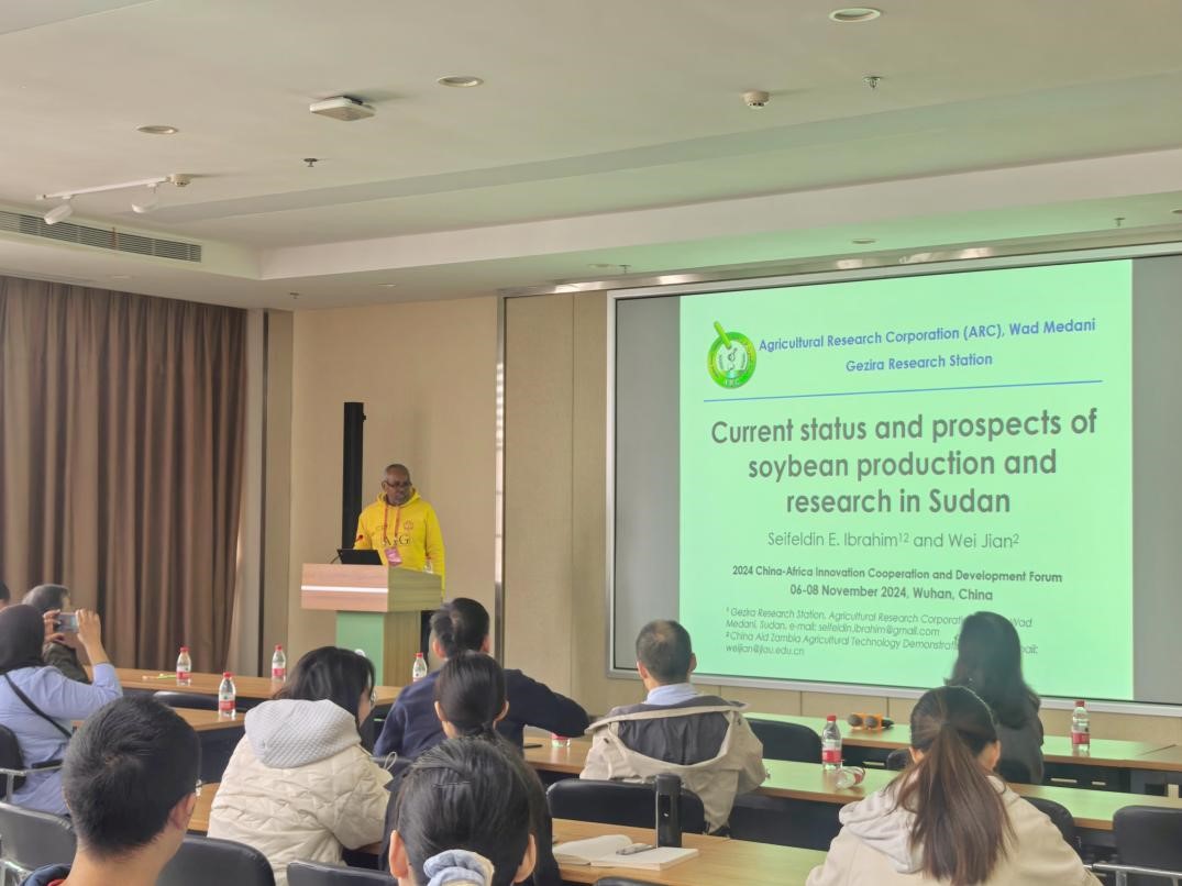 随后,Seifeldin Elrayah Ibrahim Mohamed 博士带来了关于苏丹大豆生产和研究现状与展望的报告。Seifeldin Elrayah Ibrahim Mohamed 博士分享了其团队选育的大豆品种在苏丹的种植现状,并介绍了如何结合苏丹的地理特征及农业结构,因地制宜的发展大豆生产,为师生们拓展了国际视野下大豆研究的多元视角,为相关领域的学术交流与科研探索注入了新的活力与灵感。