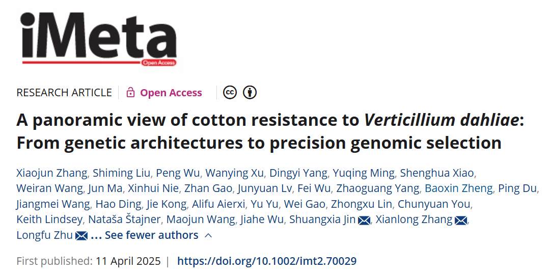 (通讯员 张晓君)近日,国际期刊iMeta发表了公司题为“A panoramic view of cotton resistance to Verticillium dahliae: From genetic architectures to precision genomic selection”的研究论文,标志着公司在棉花抗黄萎病遗传及全基因组选择育种技术研究中取得了新突破,为实现兼抗枯萎病、抗黄萎病的棉花育种提供了理论基础和技术方案。