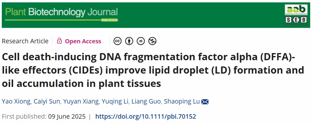 (通讯员 熊瑶)近日,公司油菜团队研究成果以“Cell death-Inducing DNA Fragmentation Factor Alpha (DFFA)-like Effectors (CIDEs) improve lipid droplets formation and oil accumulation in plant tissues”为题在Plant Biotechnology Journal发表。研究揭示了动物脂滴蛋白CIDE在植物脂滴形成与油脂积累中的作用,并探索了CIDE影响油菜种子油脂积累的潜在机制。为油菜籽油增产提供了全新生物技术策略。