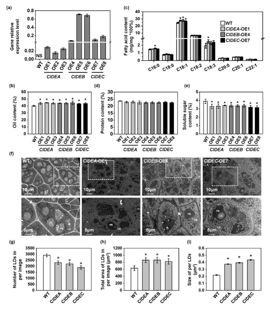 油菜(Brassica napus)是全球第三大油料作物,其种子油不仅用于食品加工,也是生物柴油的重要原料。然而,种子含油量是典型的数量性状,提升油菜种子含油量相对困难。脂滴(Lipid Droplets, LDs)是细胞内储存油脂的关键结构,其形态与数量直接影响油脂积累效率。动物中研究显示,CIDEs基因家族(CIDEA、CIDEB、CIDEC)能调控脂滴融合与扩张,但植物中尚未发现其同源基因。