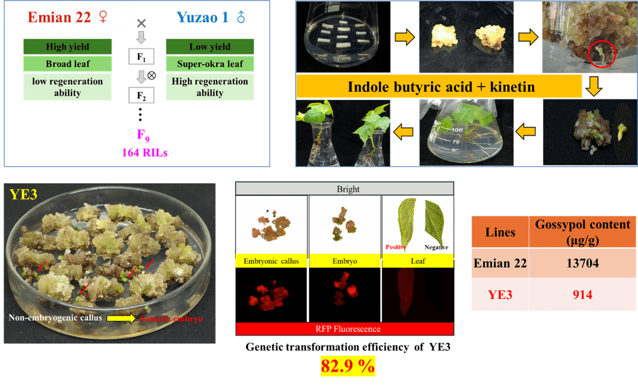 棉花是全球最重要的经济作物之一,棉纤维不仅是纺织业的天然原材料,棉籽还能供应食用油和蛋白质,在我国的经济发展中有着举足轻重的地位。传统的杂交育种法已经难以满足棉花遗传改良的需要,种质创新是棉花生物育种的热点。目前转基因技术已成为现代棉花育种的核心生物技术之一,但受体材料的局限性制约了其应用。现有转基因受体普遍存在转化效率低、转化周期长或农艺性状差等缺陷。‘豫早1号’(YZ1)作为转基因受体虽具备转化周期短、效率高的优势,但其鸡脚叶形态易导致早衰,后期光合效率较低,且全株无腺体,抗虫性差,产量和纤维品质难以满足现代生产需求。为了保留其作为转基因受体的优势,同时改良其农艺性状,该团队将其与再生能力低但高产的阔叶棉品种‘鄂棉22’(E22)进行杂交,通过单粒传法构建了包含164个株系的F9代重组自交系群体。采用IBA+KT和2,4-D+KT两种激素组合对该群体进行再生能力的筛选,获得12个高再生能力的阔叶棉株系。经遗传转化效率评估,最终筛选出转化效率高达82.9%的优良株系YE3。YE3综合了双亲的优良农艺性状,其衣分率达40.53%,显著高于YZ1的35.43%;纤维长度、强度和细度(马克隆值)等指标均优于YZ1。尤为重要的是,YE3不仅极大缩短了遗传转化周期,同时其植株具有色素腺体,可增强抗虫性,而棉铃和种子无腺体,棉酚含量极低,可安全用于食用油和饲料蛋白生产,具有广阔的应用前景。