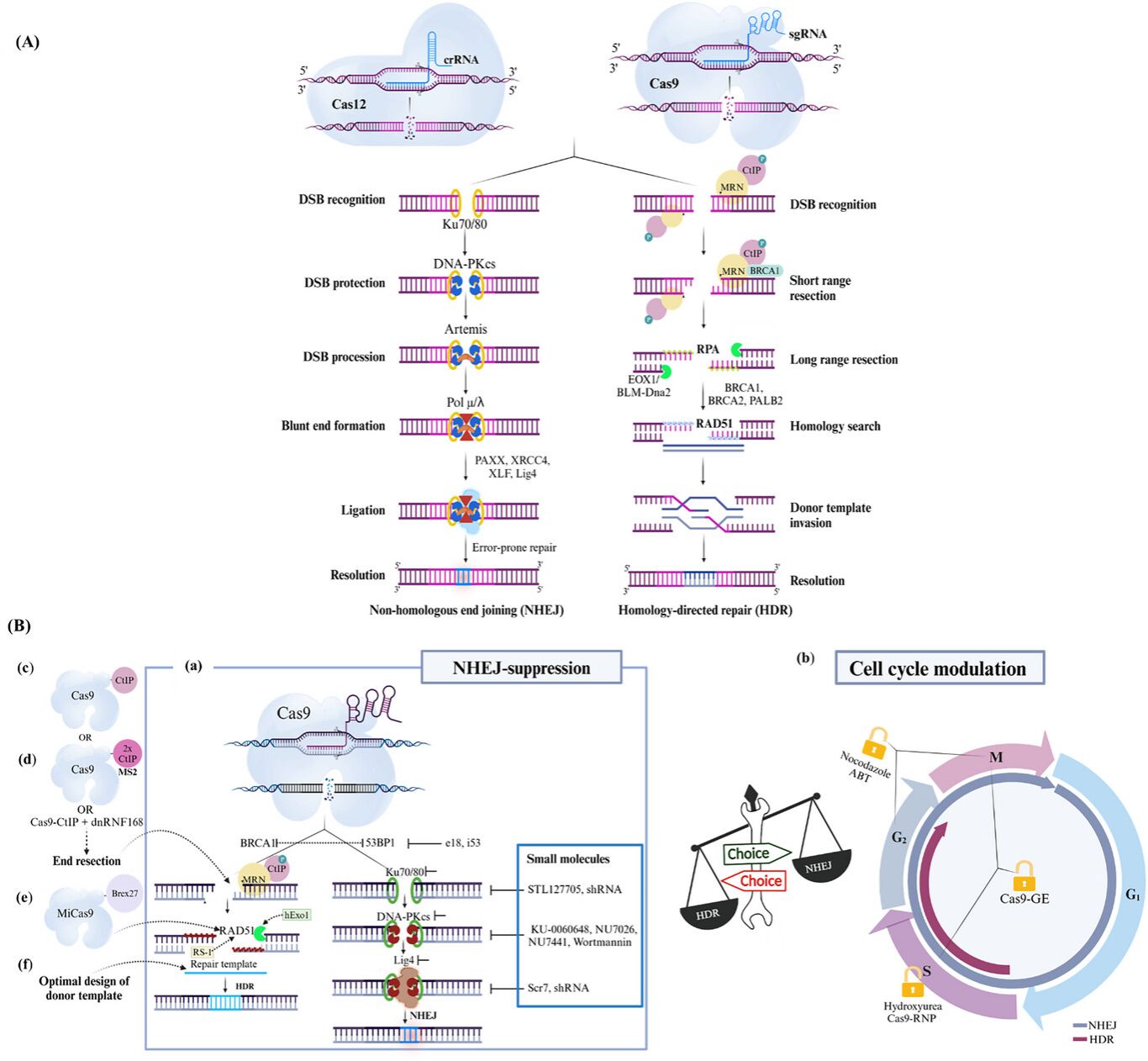 图2 CRISPR诱导双链断裂(DSBs)后,非同源末端连接(NHEJ)与同源定向修复(HDR)之间的DNA修复途径选择。(A) 非同源末端连接(NHEJ) 是一种易出错的修复机制,由Ku70/80和DNA-PKcs启动,导致末端保护和由Lig4介导的连接,通常产生插入/缺失(indels)。相比之下,同源定向修复(HDR) 依赖于MRN复合体以及Exo1/DNA2-BLM进行的末端切除,随后是RAD51介导的、利用同源模板进行的链侵入,从而实现精确修复。(B) 使修复偏向HDR的策略包括:(a) 抑制NHEJ(例如,靶向53BP1或DNA-PKcs);(b) 将细胞同步在S/G2期; (c-f) 通过Cas9融合蛋白(例如,融合CtIP、BRCA2功能域)增强切除,以及优化供体DNA设计。这些方法旨在提高基因组编辑的精确性。