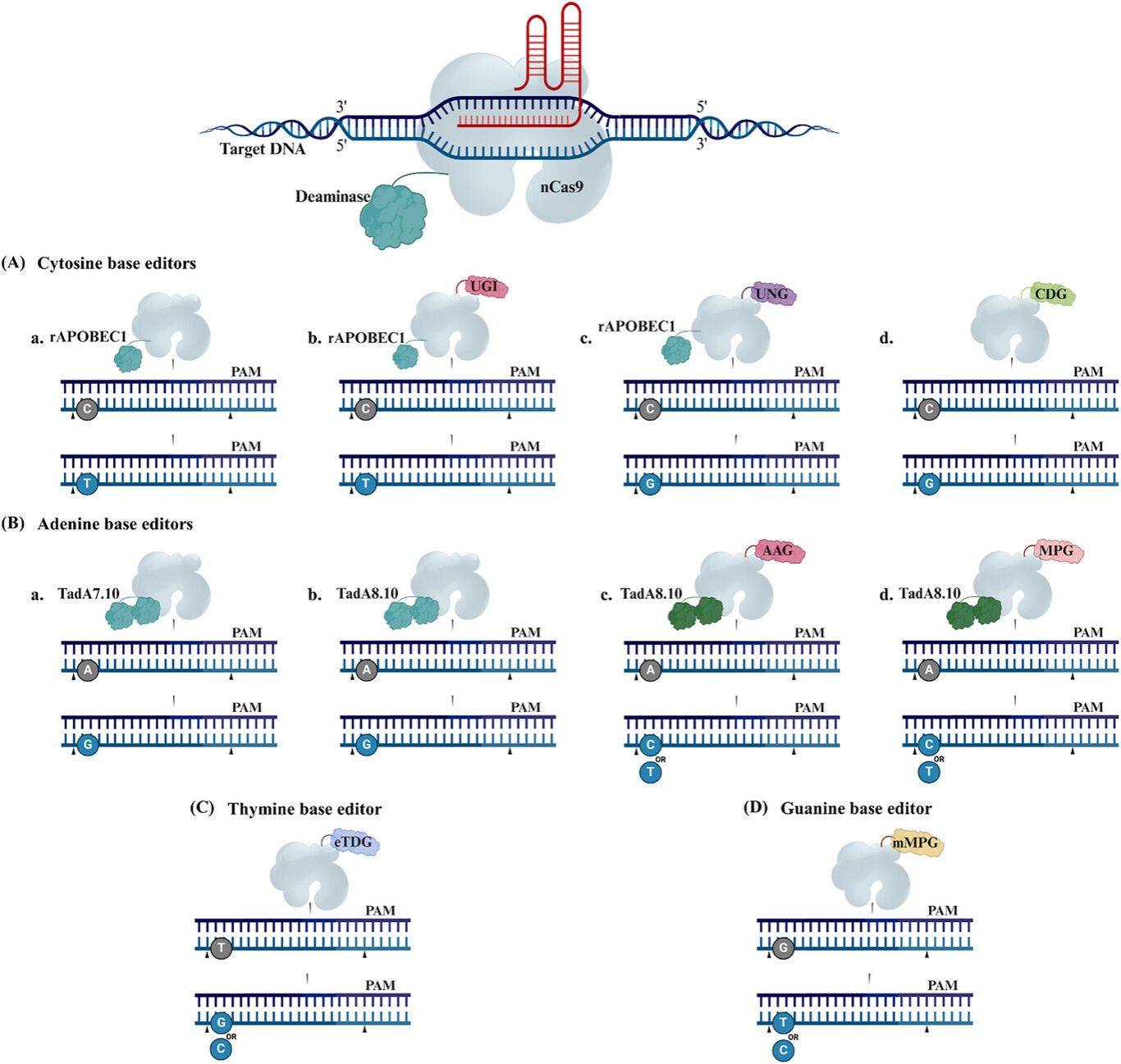 图3 CRISPR碱基编辑器的机制,这些编辑器可在不诱导双链断裂的情况下实现精确的单核苷酸编辑。(A) 胞嘧啶碱基编辑器 (CBEs):使用与胞嘧啶脱氨酶(例如 rAPOBEC1)融合的切口酶Cas9 (nCas9),将 C 转化为 T;其中,尿嘧啶糖基化酶抑制剂 (UGI) 可增强编辑效率,而融合尿嘧啶-DNA糖基化酶 (UNG) 或胞嘧啶脱氨酶与DNA糖基化酶 (CDG) 则能实现 C→G 编辑。(B) 腺嘌呤碱基编辑器 (ABEs):利用工程化的TadA变体(例如 TadA7.10 或 TadA8e)实现 A→G 转换;而与糖基化酶(如 AAG 或 MPG)融合则可扩展编辑范围,实现 A→C 或 A→T 编辑。(C) 胸腺嘧啶编辑器 和 (D) 鸟嘌呤编辑器:分别利用直接与 nCas9 融合的糖基化酶(如 UNG 或 MPG)来实现 T→G/C 或 G→T/C 的碱基替换——所有这些系统均无需外源的脱氨酶。总的来说,这些系统拓宽了可编程碱基编辑的应用范围。