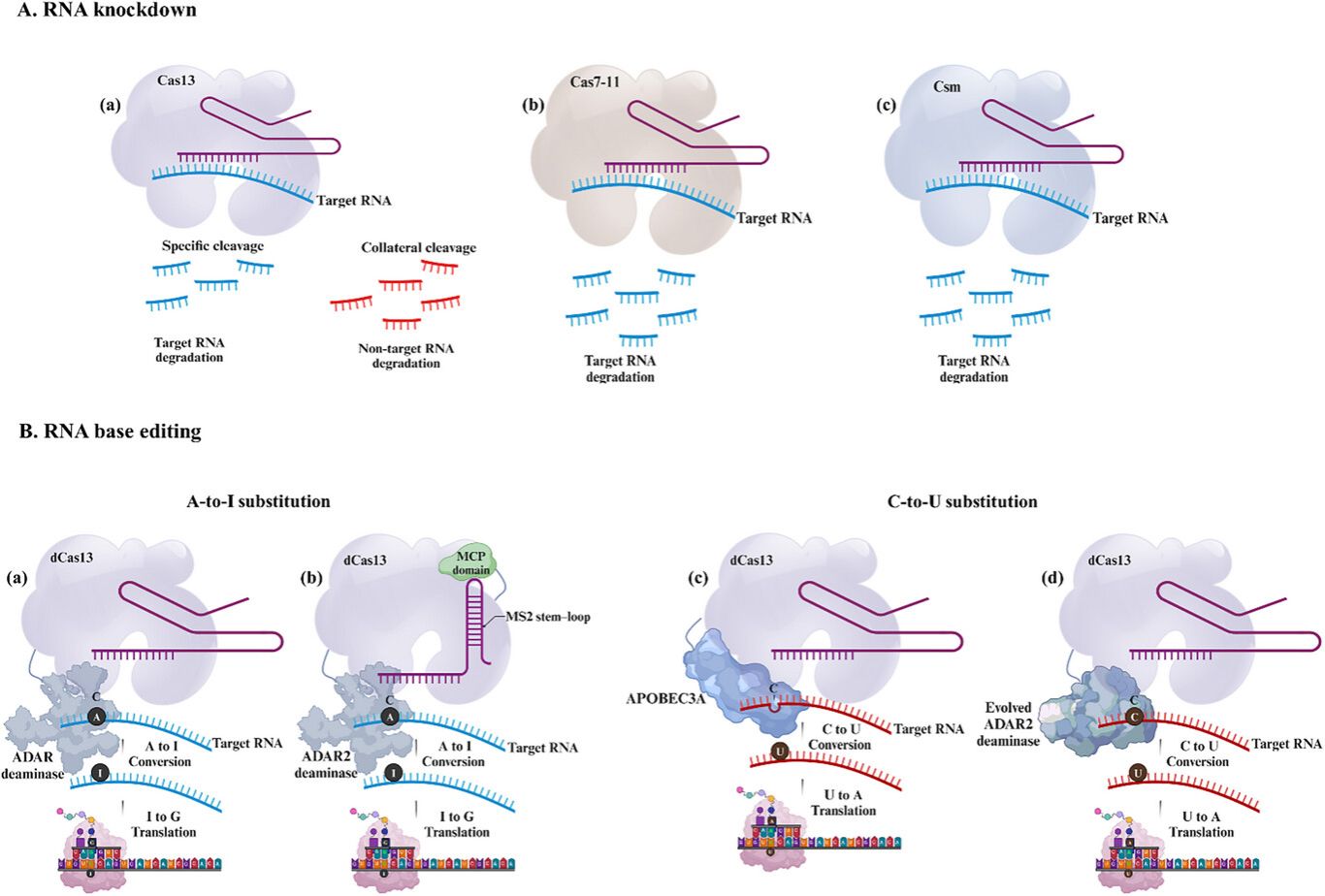 图7 展示了CRISPR介导的RNA靶向技术,用于RNA敲降和精确碱基编辑。(A) RNA敲降系统:(a) Cas13 切割靶标单链RNA,并具有附带切割活性,(b) Cas7-11 能够实现精确的RNA降解,且无附带效应,(c) 多亚基Csm复合物 执行可编程的RNA切割。(B) RNA碱基编辑:(a-b) 基于ADAR的系统(使用dCas13或MS2-MCP进行招募)可实现A→I(腺苷到肌苷)编辑;(c-d) RESCUE(基于进化的ADAR2)和CURE(基于APOBEC3A突变体)系统则通过靶向胞嘧啶脱氨作用实现C→U(胞苷到尿苷)转换。这些工具将CRISPR的应用扩展到了转录组工程领域,且不产生永久性的基因组改变。