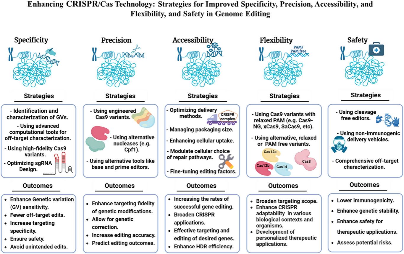 图8优化CRISPR/Cas技术的五大关键领域战略进展:特异性 (Specificity):高保真Cas9变体、考虑遗传变异(GV)的sgRNA设计,以及计算脱靶预测;精确性 (Precision):工程化核酸酶、用于单核苷酸编辑的碱基编辑器/先导编辑器;可操作性 (Accessibility):改进的递送系统、紧凑型包装(如AAV递送),以及增强同源定向修复(HDR);灵活性 (Flexibility):无PAM限制的Cas变体(如Cas12b/Cas3),实现更广泛的靶向;安全性 (Safety):非免疫原性递送、严格的脱靶筛选,以及治疗风险管控。总而言之,这些创新旨在最大化CRISPR的效能,同时最小化其在多样化应用场景中的脱靶效应。
