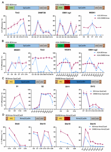 此外,该系统兼容性极强,可与多种 Cas9 变体(SpCas9、SpaCas9 等)及脱氨酶变体(A3A、A3G 等)适配,编辑效率都得到了进一步提高。