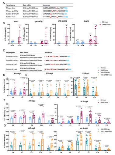 研究团队进一步在动物胚胎、烟草及棉花等不同体系中对 DMCBEs 进行了全面验证,展现出强大的应用潜力:在小鼠和兔胚胎中,DMBE4max对PAM近端位点的编辑效率达 8%-94%,而传统 BE4max在此类位点几乎无编辑活性;在烟草中,DMBE4max对NtPDS 基因的编辑效率最高达 84.78%,较 BE4max 提升 2.4 倍,且成功编辑了此前无法触及的 C1、C13 位点;在棉花愈伤组织中,针对 GhALS 基因的编辑效率提升了0.43-3.23倍,A3A-DMBE4max变体在 C13 位点的编辑效率达到 61.37%。