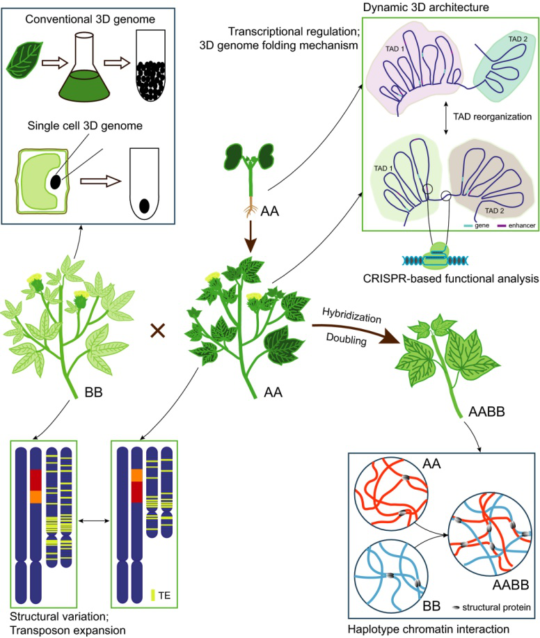 近日,作物遗传改良国家重点实验室棉花遗传改良团队发表了题为“Plant 3D genomics: the exploration and application of chromatin organization”的综述文章,总结了三维基因组研究方法的最新进展,归纳了三维基因组学规律在植物中的应用,同时提出了三维基因组学在植物研究中的未来发展方向。