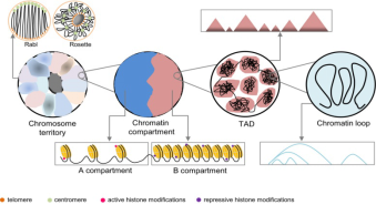 运用这些技术,在植物中发现了跟动物中类似的层级结构(图1)。核小体相互作用形成染色质纤维,然后这些染色质纤维由于顺式元件之间的相互作用而形成染色质环。染色质环在结构蛋白以及调控因子的作用下形成相对稳定的拓扑结构域(TAD)。在相似的表观遗传环境中,TAD相互作用形成染色质区室,并且同一染色体上的所有染色质区室合并形成染色体疆域。同时,植物中的结构与动物中也存在差异,最突出的是TAD结构的差异。植物中的TAD结构缺乏动物中显著的CTCF绝缘蛋白,与动物中的功能也有所不同。