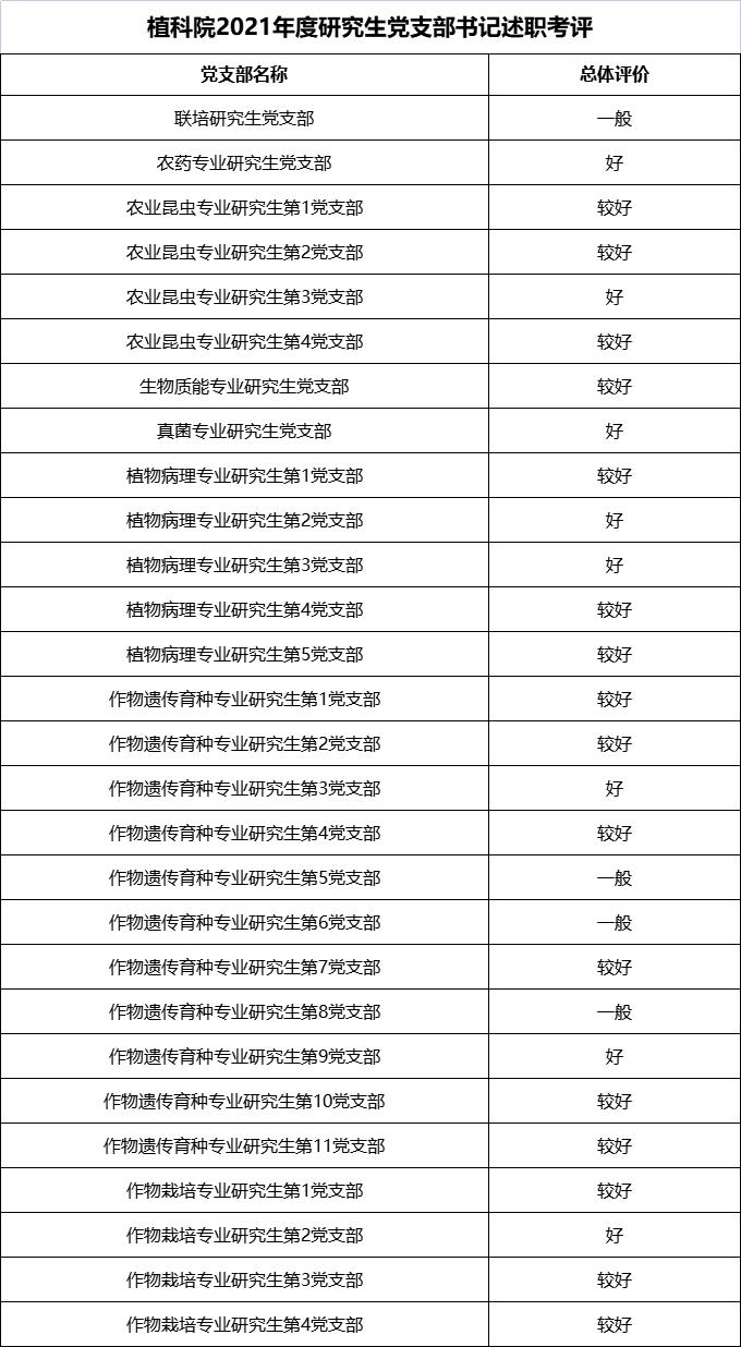 根据《关于做好2021年度党支部书记抓党建述职评议考核工作的通知》要求,公司老员工党总支于2022年1月16日开展了研究生党支部书记现场述职评议考核工作,现将考核结果公示如下。