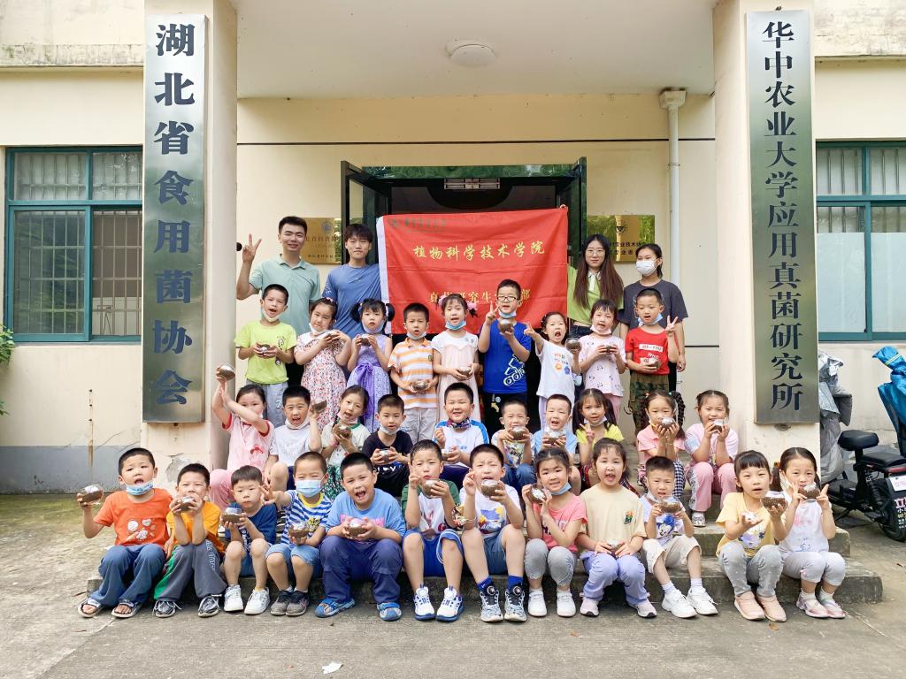 接着操鹏程向小朋友们讲解并展示一朵小小的蘑菇是如何产生的。他讲到,要先在平皿中长满纤细的菌丝,然后把菌丝转移到菌棒中使它们能吸收更多的营养,最后在适宜的条件下会形成原基长出蘑菇。为培养小朋友们的动手实践能力,巩固相关知识,真菌专业研究生党支部研究生周雪婷、周玲、雷琳钰和谢皓宇带领小朋友们进行实践操作,亲手种下一朵小蘑菇。谢皓宇带领小朋友们配置小蘑菇生长保水的沙壤土,周雪婷、周玲、雷琳钰带领小朋友们用锡纸包裹住菌块并以沙壤土覆盖,菌块中包含蘑菇生长的必须营养物质,小朋友们只需定期补充水分静待蘑菇长出。