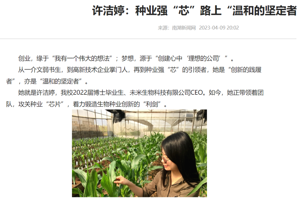 甘做种业候鸟,积极投身乡村振兴事业。支部成员如“候鸟”,近3年累计近100人次跨越1500多公里前往海南岛南繁3000亩基地培育新品种;投身“乡村振兴荆楚行”,驻扎襄阳智慧农业基地,深度开展智慧化种植设备训练,带动产业链实现经济效益100万元,为建设国家农业核心示范区提供有力支撑;扎根西藏林芝,深挖本土资源,深入农户搜集163份多样化本地种质。支部为海南、西南、东北等区域农技人员、农民开展玉米科学培训累计18次,累计服务1000人次,推动区域农业现代化发展。博士生许洁婷创办未米生物科技有限公司,攻关种业“芯片”,实现种业企业五年市值过亿,把文章写在祖国的大地上。