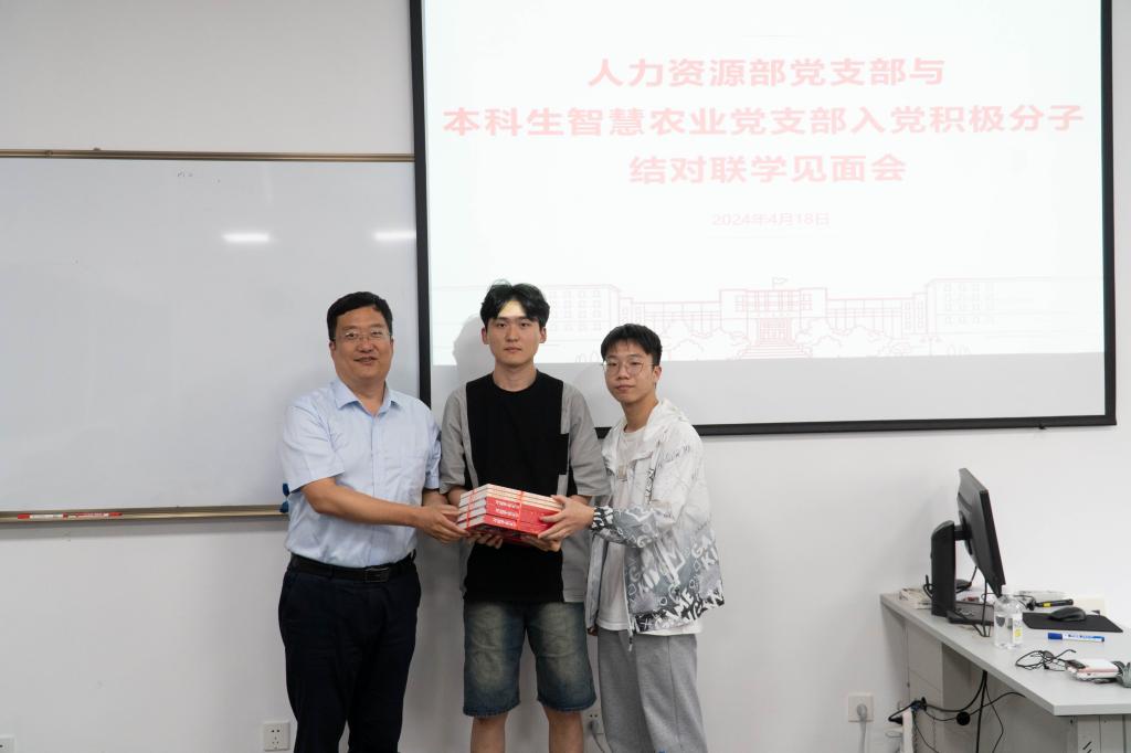 在智慧农业创新教室中,人力资源部副部长赵希庆代表支部党员亲切问候在场同学,一一介绍了支部成员与所指导的入党积极分子。各“红色导师”与入党积极分子们畅谈老员工活,并向同学们赠送《习近平在正定》、《党代会简史:从一大到二十大》等红色书籍,期待同学们与书为友,提升认识。赵希庆谈到,人力资源部党支部与智慧农业党支部结对共建是公司“党建质量源头提升工程”的工作内容,是切实推动教师党员发挥对入党积极分子的涵育功能、积极引导青年员工成长成才的重要举措。