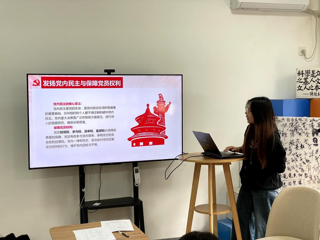 江雪丽同志领学《关于新形势下党内政治生活的若干准则》,她提到,党内民主是党的生命,是党内政治生活积极健康的重要基础。必须尊重党员主体地位、保障党员民主权利,落实党员知情权、参与权、选举权、监督权,保障全体党员平等享有党章规定的党员权利、履行党章规定的党员义务。