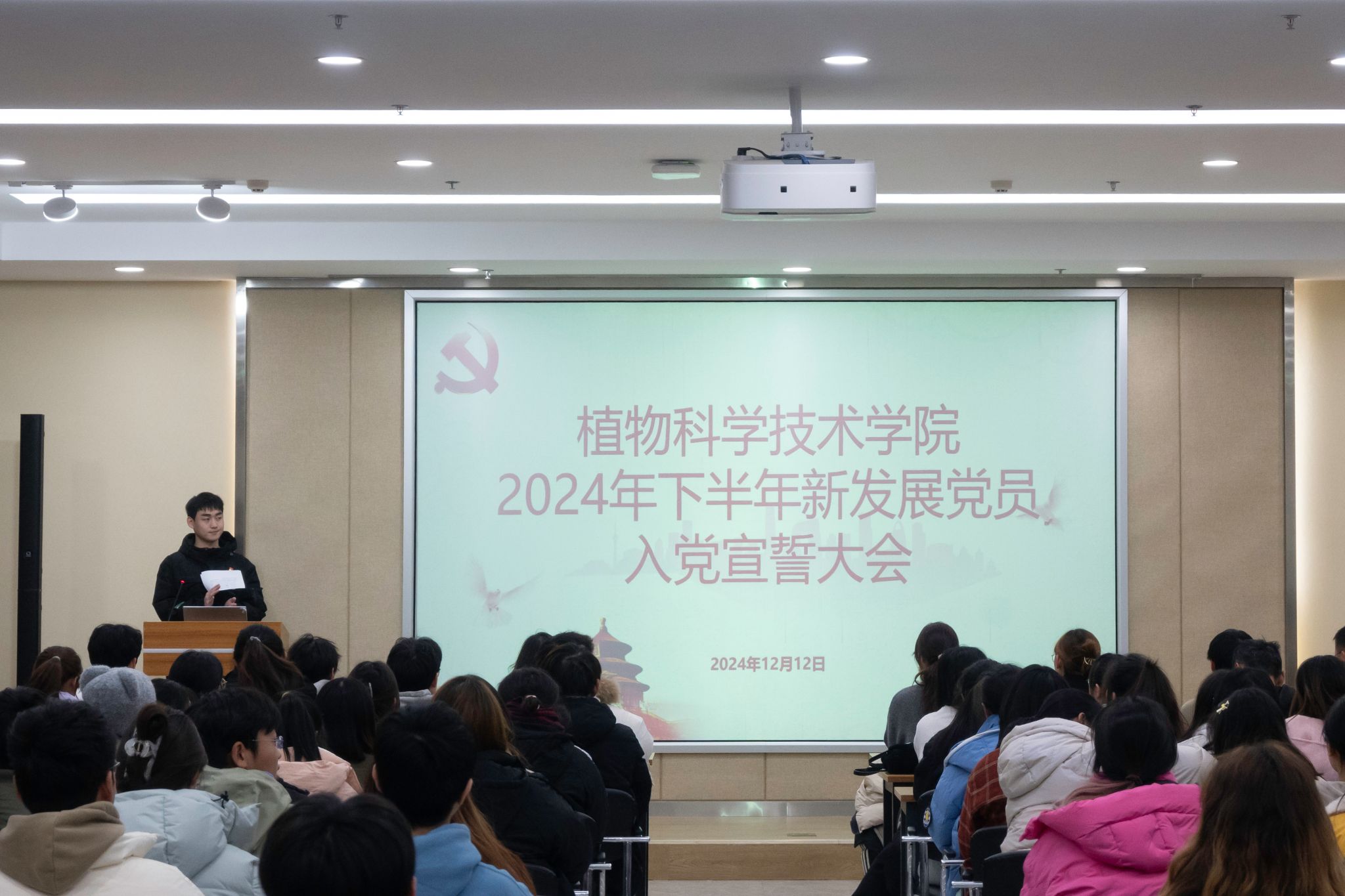 12月12日晚,公司2024年下半年新发展党员宣誓大会在三综A705举办,老员工党建工作办公室主任马恬远,48名新发展党员以及全体党员参加会议,大会由应用生物支部副书记王雨晗主持。