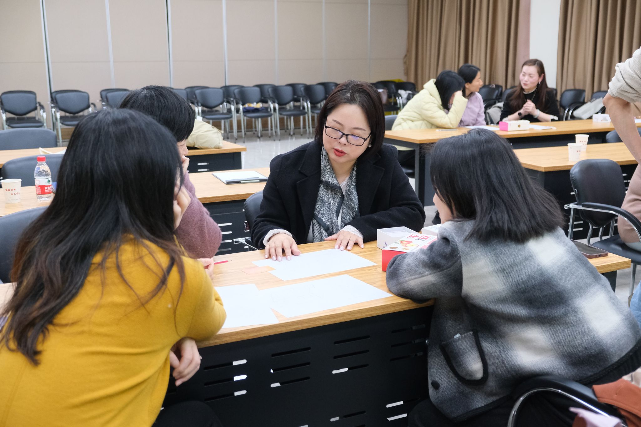 随后,韩薇老师将教职工分为五个小组,让每位教职工以房屋,树木和人物为主体进行绘画。绘画完毕,引导员们通过对每幅画作的观察以及与每位创作者的交流,深度解析了他们当下的心理状况,并根据不同的心理状况给出了不同的建议。