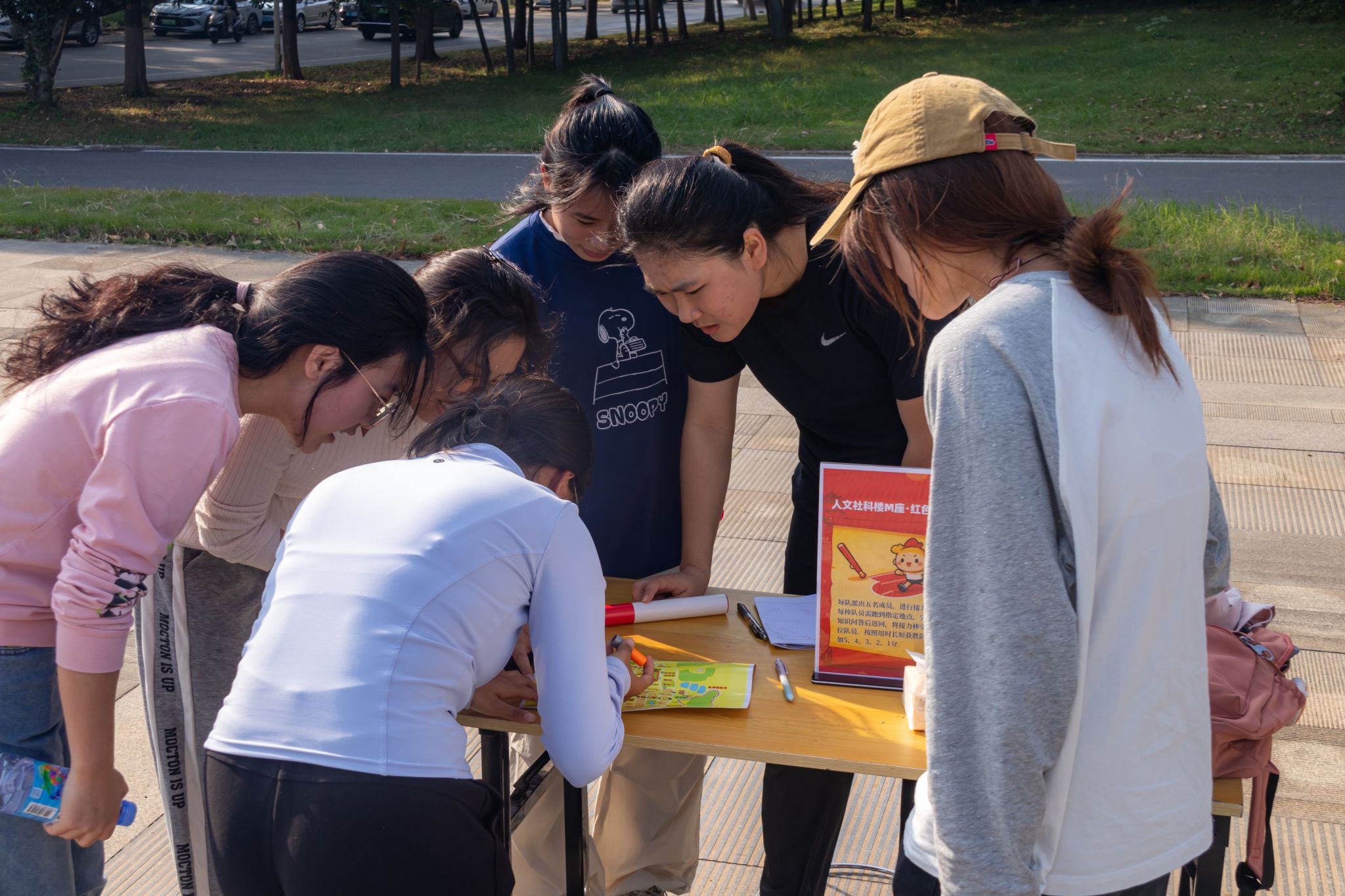 南湖岸畔的任务点,队员们轮流抽取“瓦窑堡会议”“南昌起义”等历史事件卡片并现场排序,在实践操作中深化对党史的理解与领会。应生2201班刘嘉怡深有感触:“过去这些会议、起义的名称只是课本里的黑体字,如今变成了触手可及的卡片。这种‘亲手将历史放回原位’的仪式感,让党史从平面走向立体。”乐乐园露天舞台上,小组成员踮脚站于布面,相互依偎支撑,全力保持平衡,在协作中凝聚团队力量;西体育馆台阶前,各队伍抽取红色多人照片进行一比一复刻,欢笑声与指挥声交织,现场氛围热烈融洽。