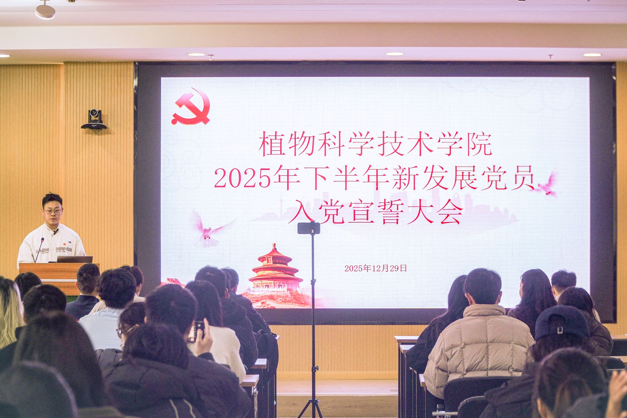 随后,党员代表为新发展党员佩戴党员徽章,传承红色基因,践行初心使命,激励新党员牢记身份,勇担责任。新发展党员研究生代表白雨静上台发言表示,将把入党作为新的起点,持续强化理论武装,立足专业深耕科研,服务同学奉献社会。本科生代表冷子文琪分享了家庭熏陶与党史学习带来的深刻感悟,承诺将以农科学子的身份,将汗水洒向田野,把论文写在大地,为实现中华民族伟大复兴贡献青春力量。