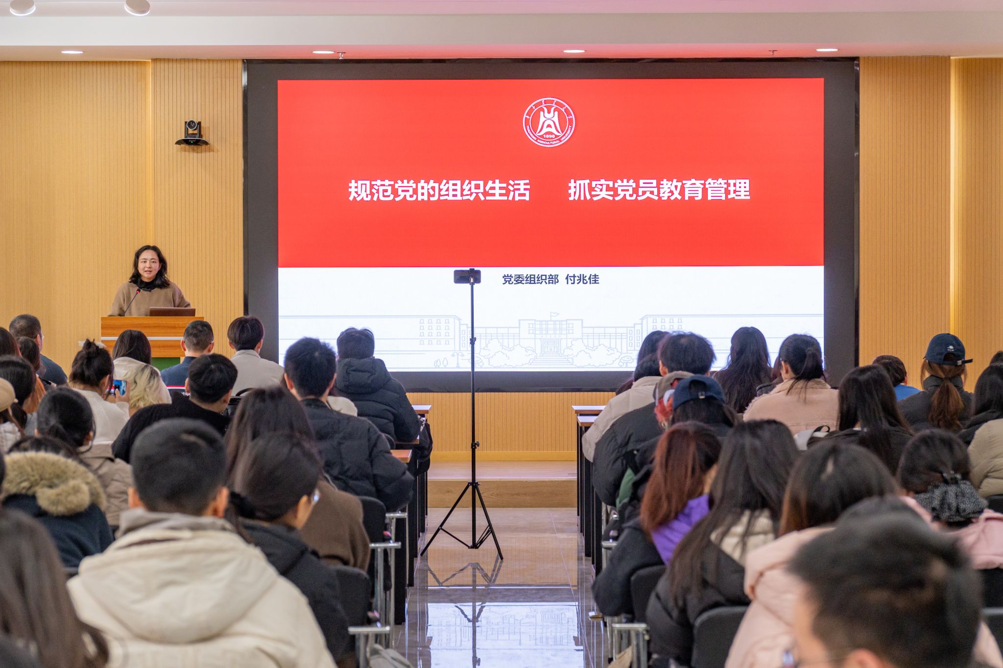 培训主要围绕“党的组织生活”与“党员教育管理”两大核心板块展开。付兆佳老师系统解读了《中国共产党支部工作条例(试行)》,重点强调了党支部的任期规定 、委员会设立原则及各委员的核心职责等内容。针对基层党支部组织生活制度,付兆佳重点解读“三会一课”、组织生活会、主题党日等不同形式的内涵、功能与规范要求,强调了组织生活的政治性、规范性与实效性。在党员教育管理部分,付兆佳老师结合《中国共产党党员教育管理工作条例》,简要回顾发展党员的5个阶段25个程序,带领现场党员重新梳理党员从发展到管理的全链条,并结合《中国共产党不合格党员组织处置办法》,提醒全体党员时刻绷紧纪律之弦。最后,她特别强调了网络行为规范,希望同学们在网络空间同样要严守纪律,做到网上网下言行一致,自觉维护党组织形象。