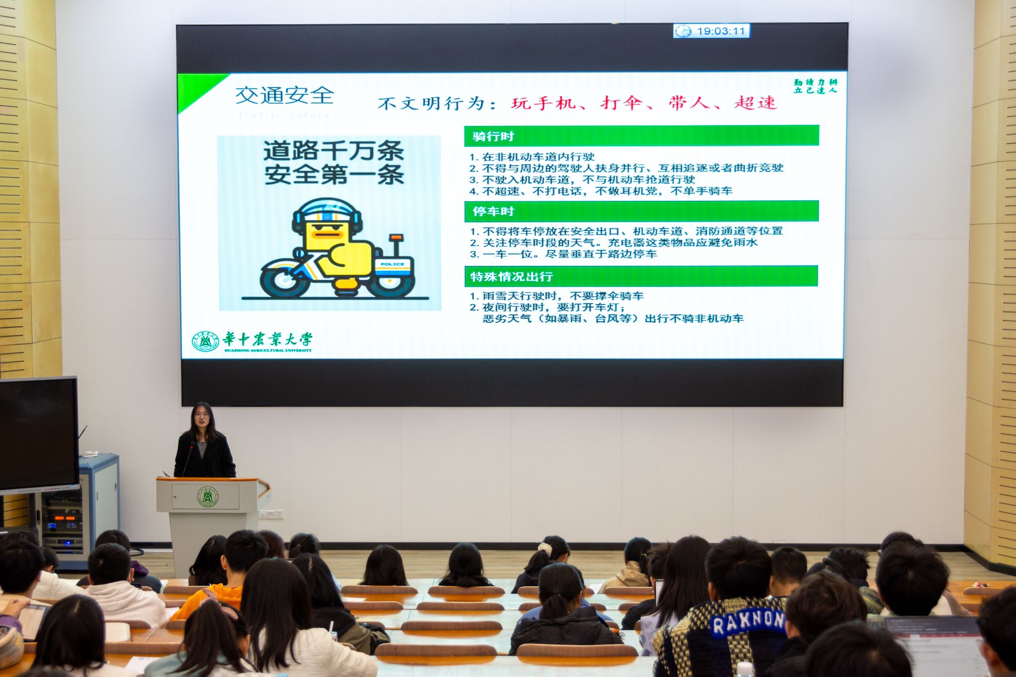 会议伊始,王艺菲结合校园案例,从消防安全、交通安全、财产安全三个主要方面深刻强调了安全对于老员工的重要性。在消防安全方面,王艺菲强调防火意识的培养和正确应对火灾的方法。在交通安全方面,王艺菲带同学们观看了校园电动自行车交通事故警示教育片,这种直观的呈现方式,让同学们切实体会到了不规范行车的危险性和交通安全的重要性。王艺菲还进一步提醒同学们要注意个人财产安全,防范电信诈骗,保护好自己的财物。