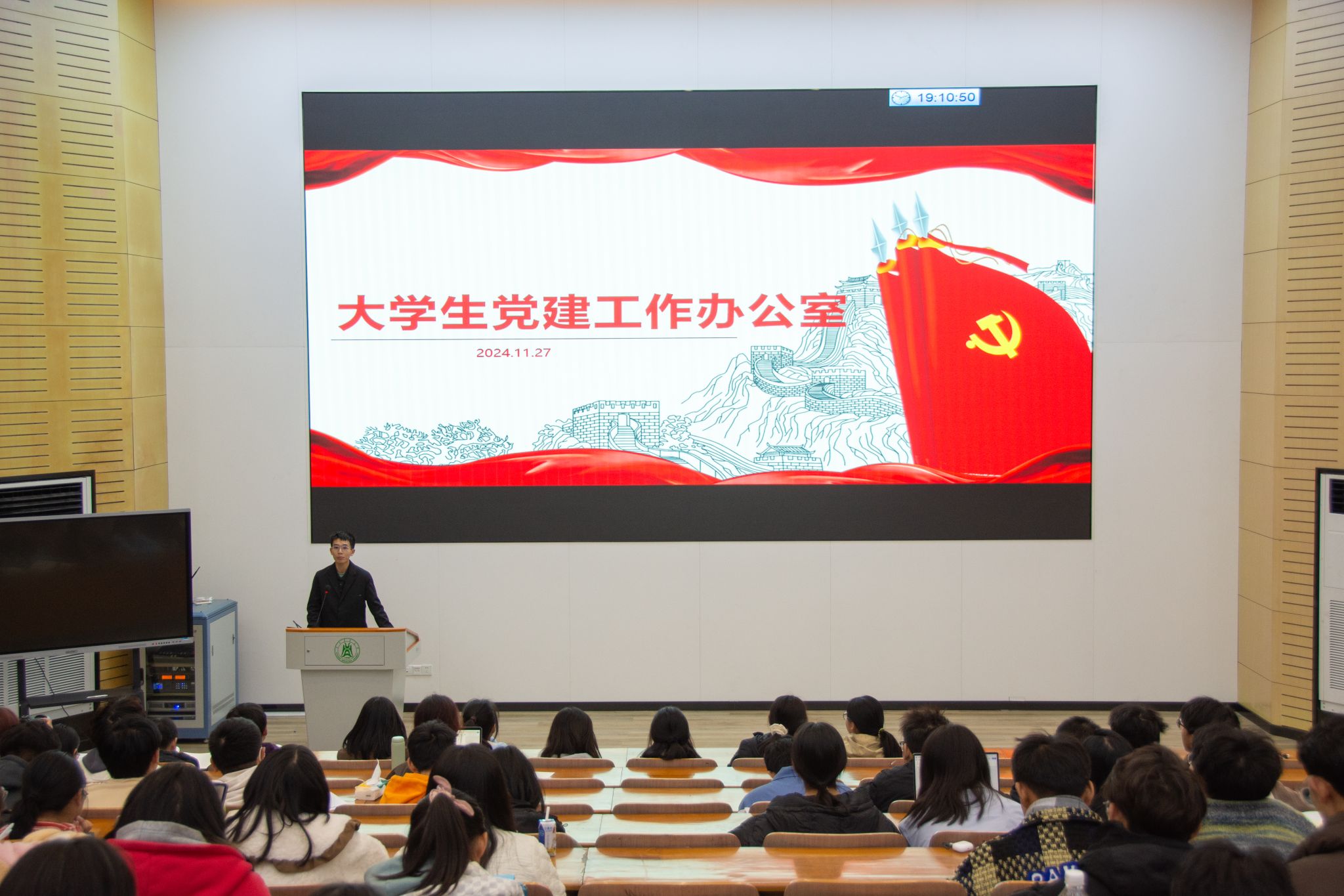 11月27日晚,公司在三教S2报告厅举办2024级本科生第三次年级大会暨党团学青双招新宣讲会,公司各部门工作人员、24级全体本科生参会,辅导员王艺菲主持会议。