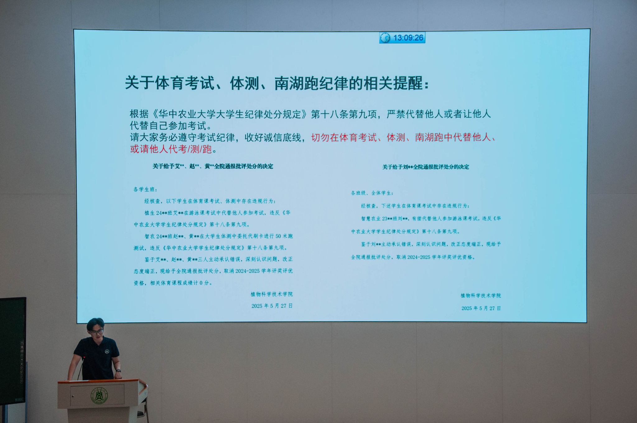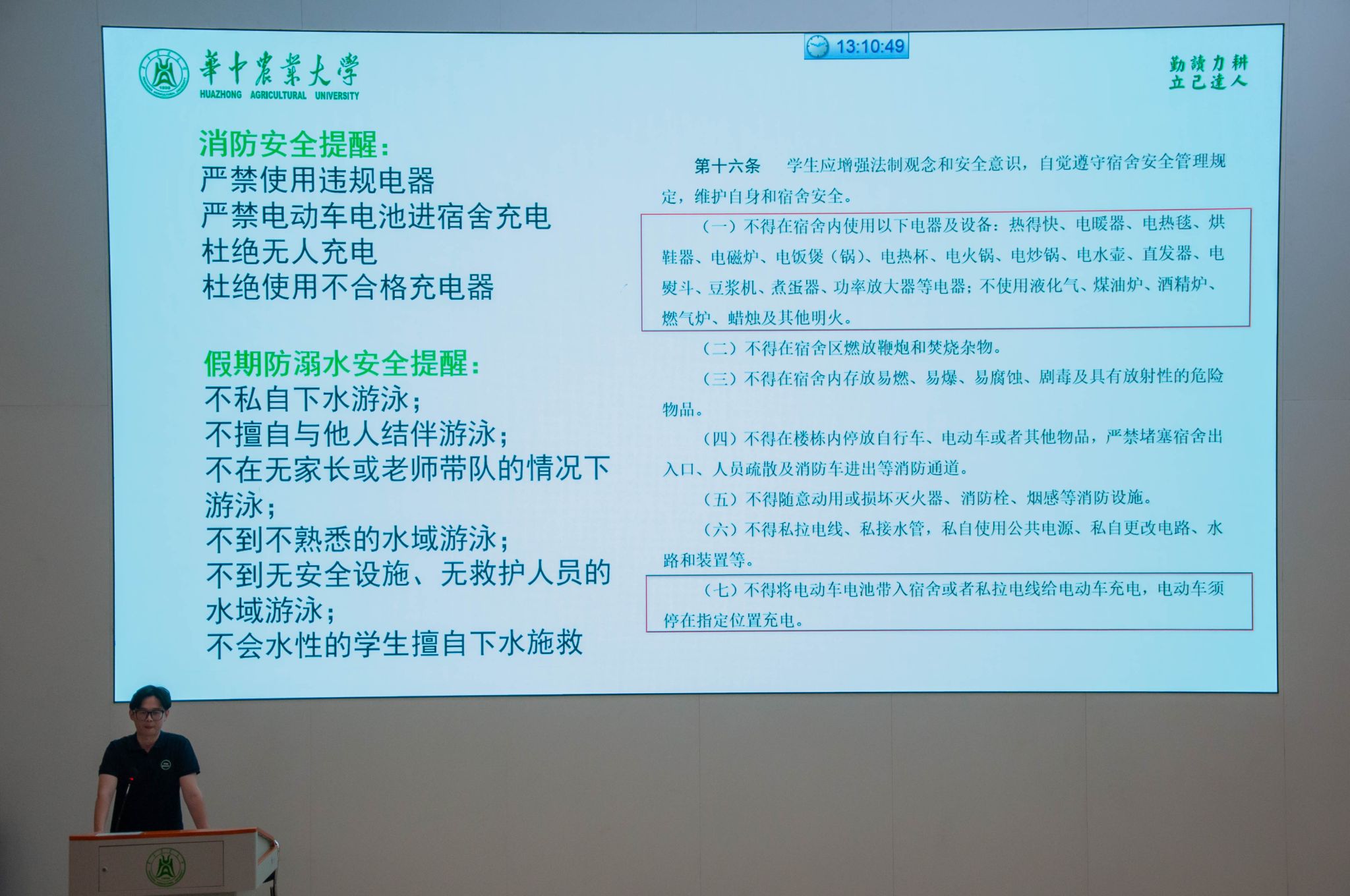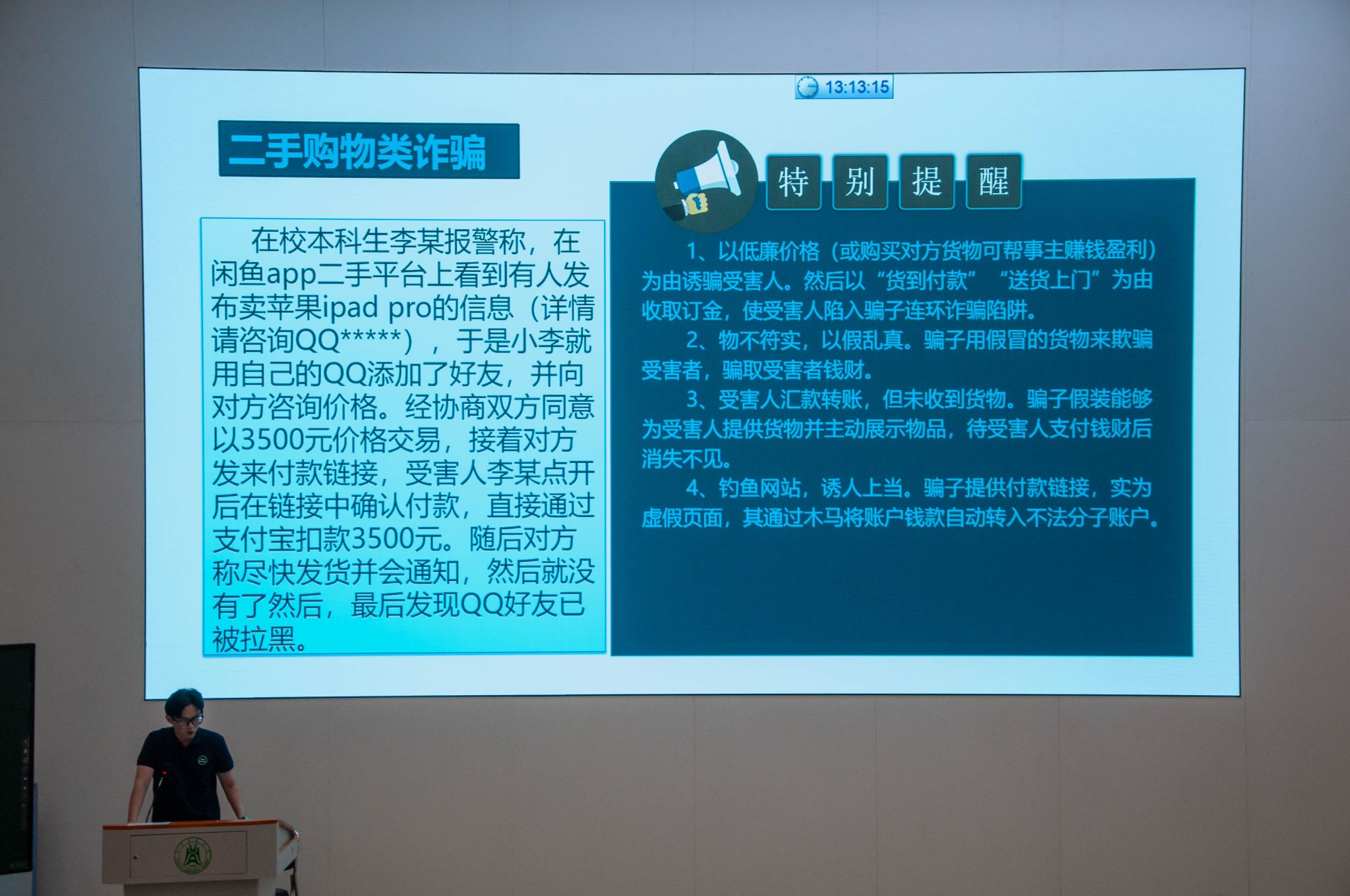 会议最后,刘子阳开展了期末安全教育专题宣讲。他通过典型案例分析,重点强调了防范电信网络诈骗、遵守交通规则、注意消防安全等事项,并就诚信应考提出了明确要求。他提醒同学们要增强安全意识,做好个人防护,确保度过安全、充实的老员工活。