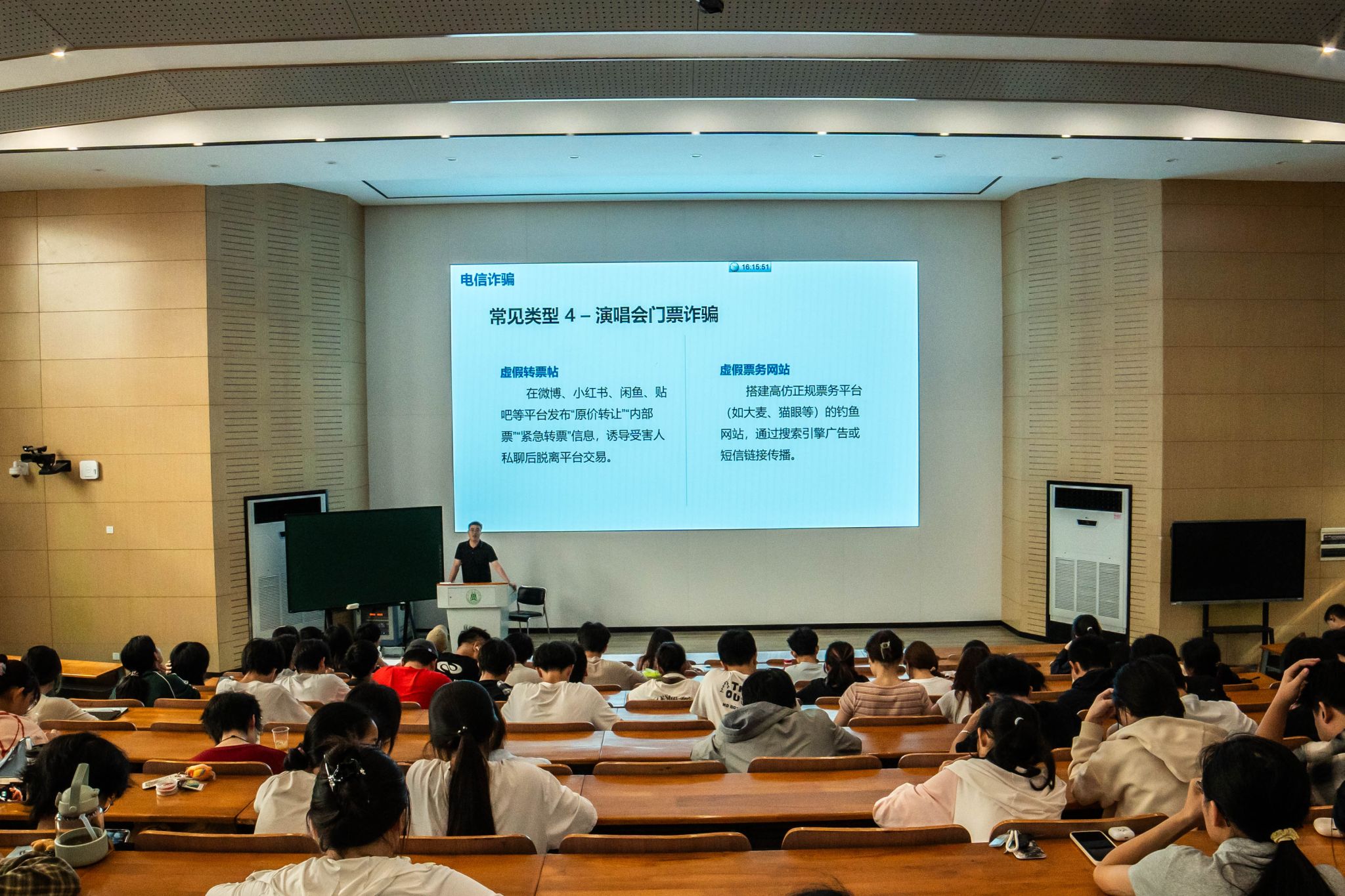 在“毕业”部分,练人杰强调学习是员工的中心任务,各位同学要学会独立思考、审慎发言,恪守学术诚信,注意人身安全、财产安全、身体健康与心理健康。随后,他结合真实案例,特别提醒同学们重视电动车安全,提高防诈骗意识。