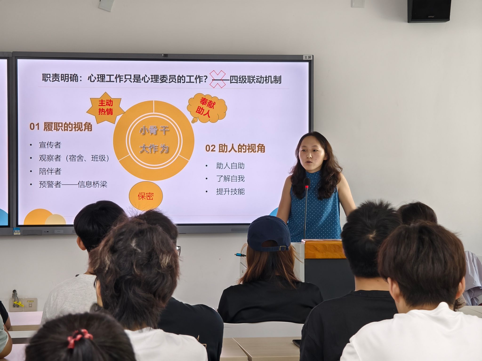 培训中,陈瑞蕊老师围绕 “心理骨干助人技巧”“常见心理疾病识别”“危机干预应知应会” 三个部分展开详细讲解。