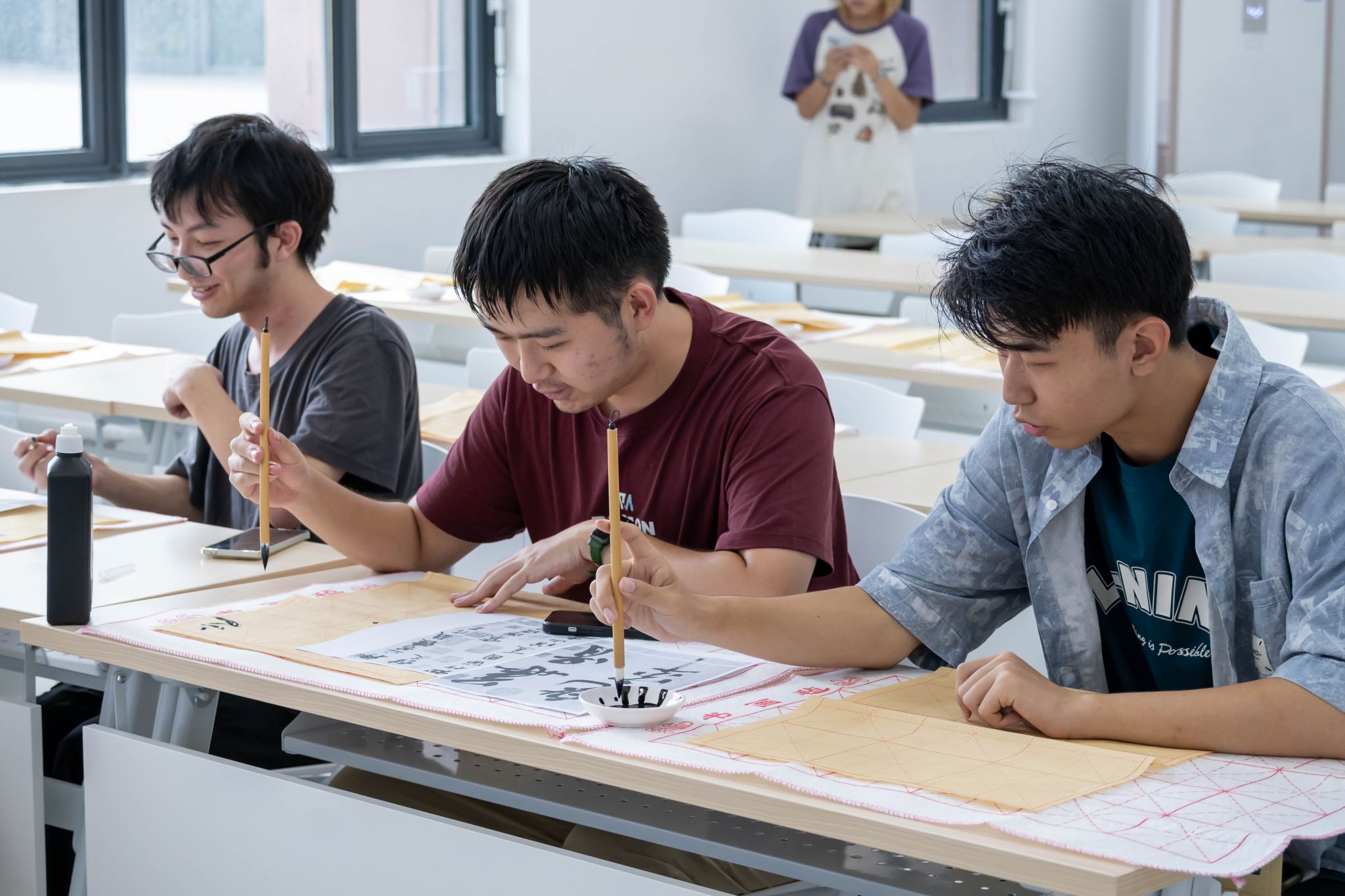 9月5日下午,“襄阳漫士”书法展在襄阳基地第二教学楼209教室举行。活动以宋代书法大家米芾为核心,讲述其“米颠拜石”的趣闻轶事,解读“功名皆一戏,未觉负平生”的超然心境,生动展现了他率真洒脱的人格魅力。随后,同学们在指导下临帖互动,近距离感受书法艺术的魅力。